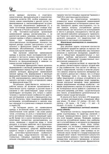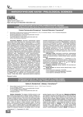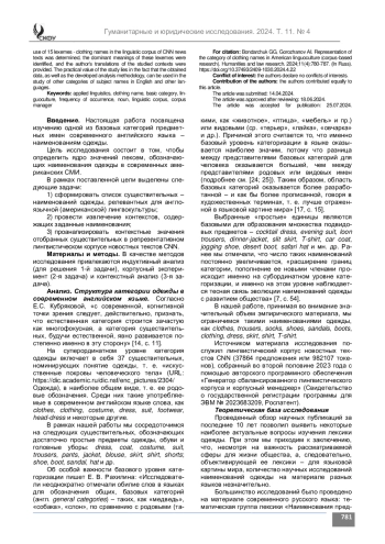 Введение. Категория наименований одежды представляет собой обширный пласт лексических единиц, обозначающих предметы одежды, обувь, головные уборы и т. п., которая является существенным артефактом человеческой деятельности и играет важнейшую роль в истории общества и культуры. Это одна из основных предметных категорий человеческого бытия, чрезвычайно важная в культурологическом и социальном отношении. Цель исследования состоит в том, чтобы определить ядро значений лексем, обозначающих наименования одежды в современных американских СМИ. Достижение цели планируется путем решения следующих задач: сформировать список существительных – наименований одежды, релевантных для англоязычной (американской) лингвокультуры; провести извлечение контекстов, содержащих заданные наименования; проанализировать контекстные значения отобранных существительных в репрезентативном лингвистическом корпусе новостных текстов CNN.