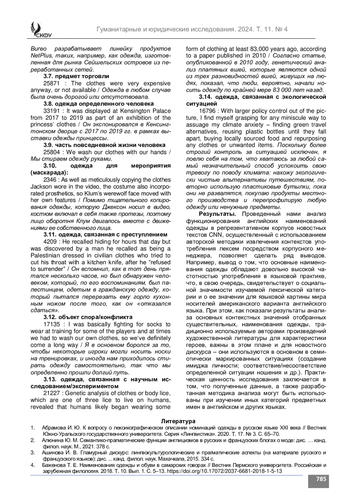 1. Абрамова И. Ю. К вопросу о лексикографическом описании номинаций одежды в русском языке XXI века // Вестник Южно-Уральского государственного университета. Серия «Лингвистика». 2020. Т. 17. № 3. С. 65-70.