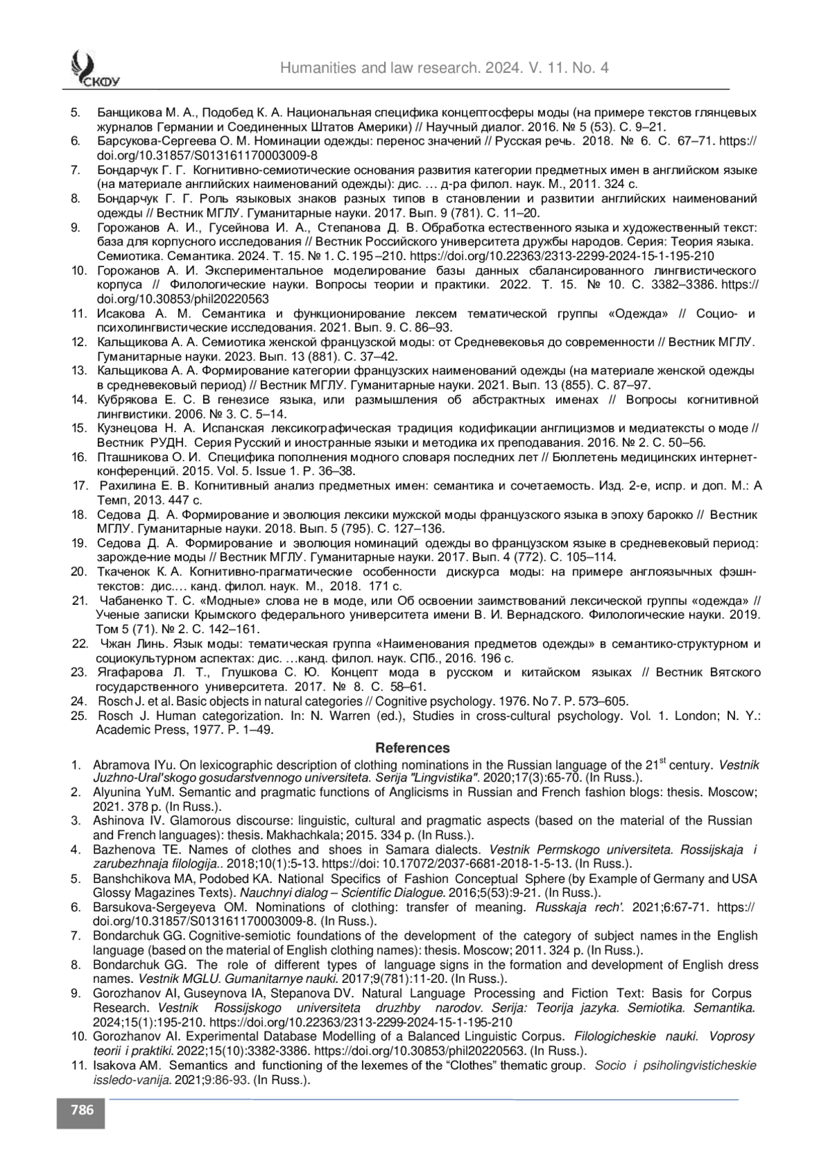 11. Исакова А. М. Семантика и функционирование лексем тематической группы «Одежда» // Социо- и психолингвистические исследования. 2021. Вып. 9. С. 86-93.