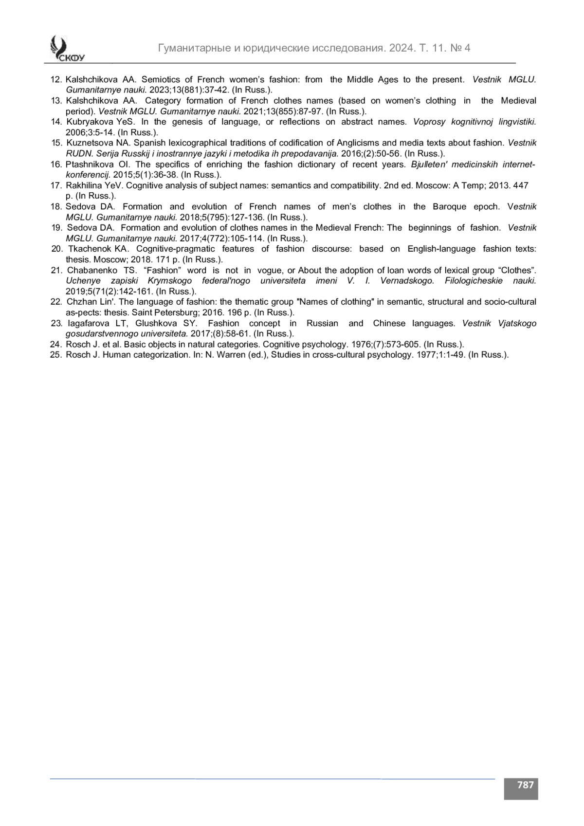 13. Кальщикова А. А. Формирование категории французских наименований одежды (на материале женской одежды в средневековый период) // Вестник МГЛУ. Гуманитарные науки. 2021. Вып. 13 (855). С. 87-97.