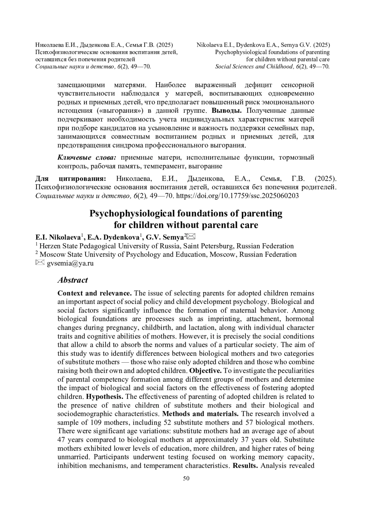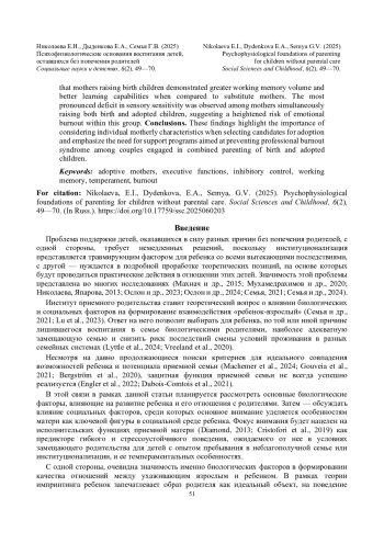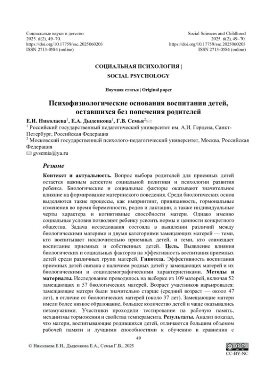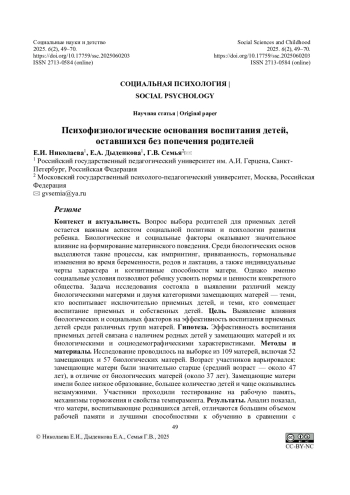 Контекст и актуальность. Вопрос выбора родителей для приемных детей остается важным аспектом социальной политики и психологии развития ребенка. Биологические и социальные факторы оказывают значительное влияние на формирование материнского поведения. Среди биологических основ выделяются такие процессы, как импринтинг, привязанность, гормональные изменения во время беременности, родов и лактации, а также индивидуальные черты характера и когнитивные способности матери. Однако именно социальные условия позволяют ребенку усвоить нормы и ценности конкретного общества. Задача исследования состояла в выявлении различий между биологическими матерями и двумя категориями замещающих матерей — теми, кто воспитывает исключительно приемных детей, и теми, кто совмещает воспитание приемных и собственных детей. Цель. Выявление влияния биологических и социальных факторов на эффективность воспитания приемных детей среди различных групп матерей. Гипотеза. Эффективность воспитания приемных детей связана с наличием родных детей у замещающих матерей и их биологическими и социодемографическими характеристиками. Методы и материалы. Исследование проводилось на выборке из 109 матерей, включая 52 замещающих и 57 биологических матерей. Возраст участников варьировался: замещающие матери были значительно старше (средний возраст — около 47 лет), в отличие от биологических матерей (около 37 лет). Замещающие матери имели более низкое образование, большее количество детей и чаще оказывались незамужними. Участники проходили тестирование на рабочую память, механизмы торможения и свойства темперамента. Результаты. Анализ показал, что матери, воспитывающие родившихся детей, отличаются большим объемом рабочей памяти и лучшими способностями к обучению в сравнении с замещающими матерями. Наиболее выраженный дефицит сенсорной чувствительности наблюдался у матерей, воспитывающих одновременно родных и приемных детей, что предполагает повышенный риск эмоционального истощения («выгорания») в данной группе. Выводы. Полученные данные подчеркивают необходимость учета индивидуальных характеристик матерей при подборе кандидатов на усыновление и важность поддержки семейных пар, занимающихся совместным воспитанием родных и приемных детей, для предотвращения синдрома профессионального выгорания.