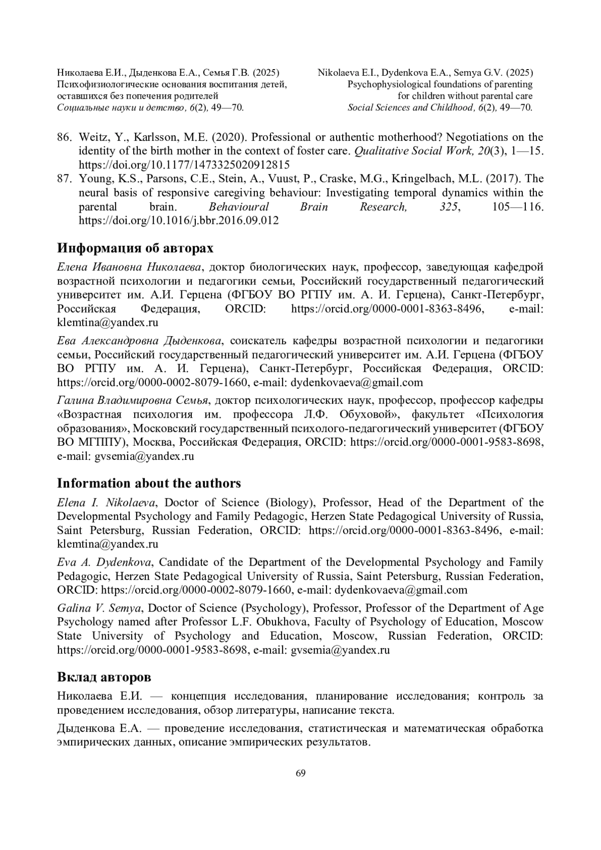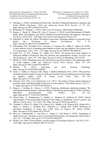 16. 	Ослон, В.Н., Одинцова, М.А., Семья, Г.В., Колесникова, У.В. (2024). Мотивация приема на воспитание детей-сирот трудноустраиваемых категорий в контексте различных форм семейного устройства, включая усыновление. Психологическая наука и образование, 29(6), 81-98. DOI: 10.17759/pse.2024290606 EDN: FQROCE