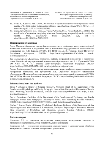 21. 	Семья, Г.В., Телицына, А.Ю., Лашкул, М.В. (2024). Адаптация к новой реальности: обзор международных исследований специфики развития детей, оставшихся без попечения родителей, в замещающих семьях и при усыновлении. Социальные науки и детство, 5(4), 65-85. DOI: 10.17759/ssc.2024050404