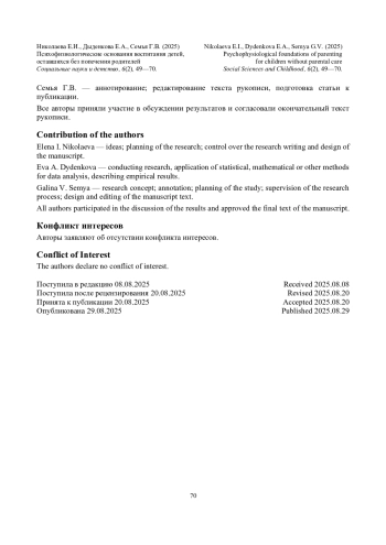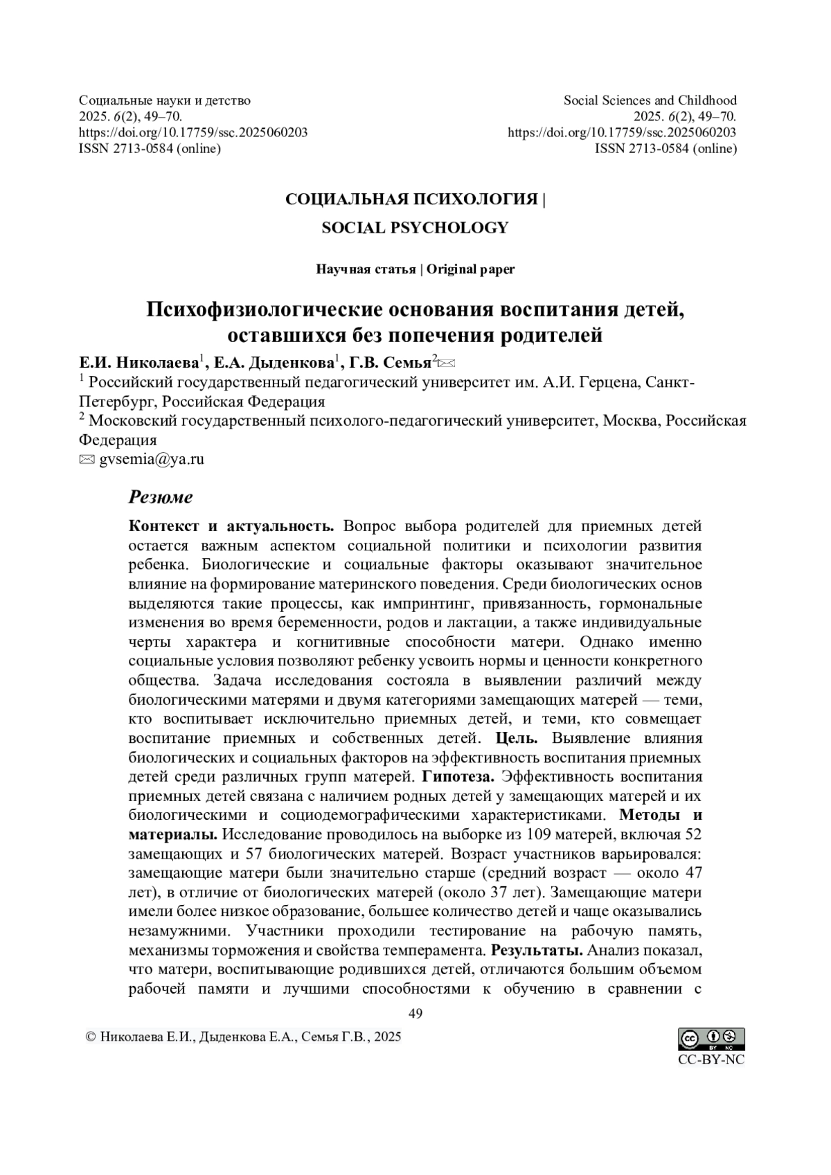 12. 	Николаева, Е.И., Япарова, О.Г. (2007). Особенности личностных характеристик детей и родителей в эффективных и неэффективных приемных семьях. Вопросы психологии, 6, 37-42. URL: item.asp?id=19134705 (дата обращения: 19.08.2025).