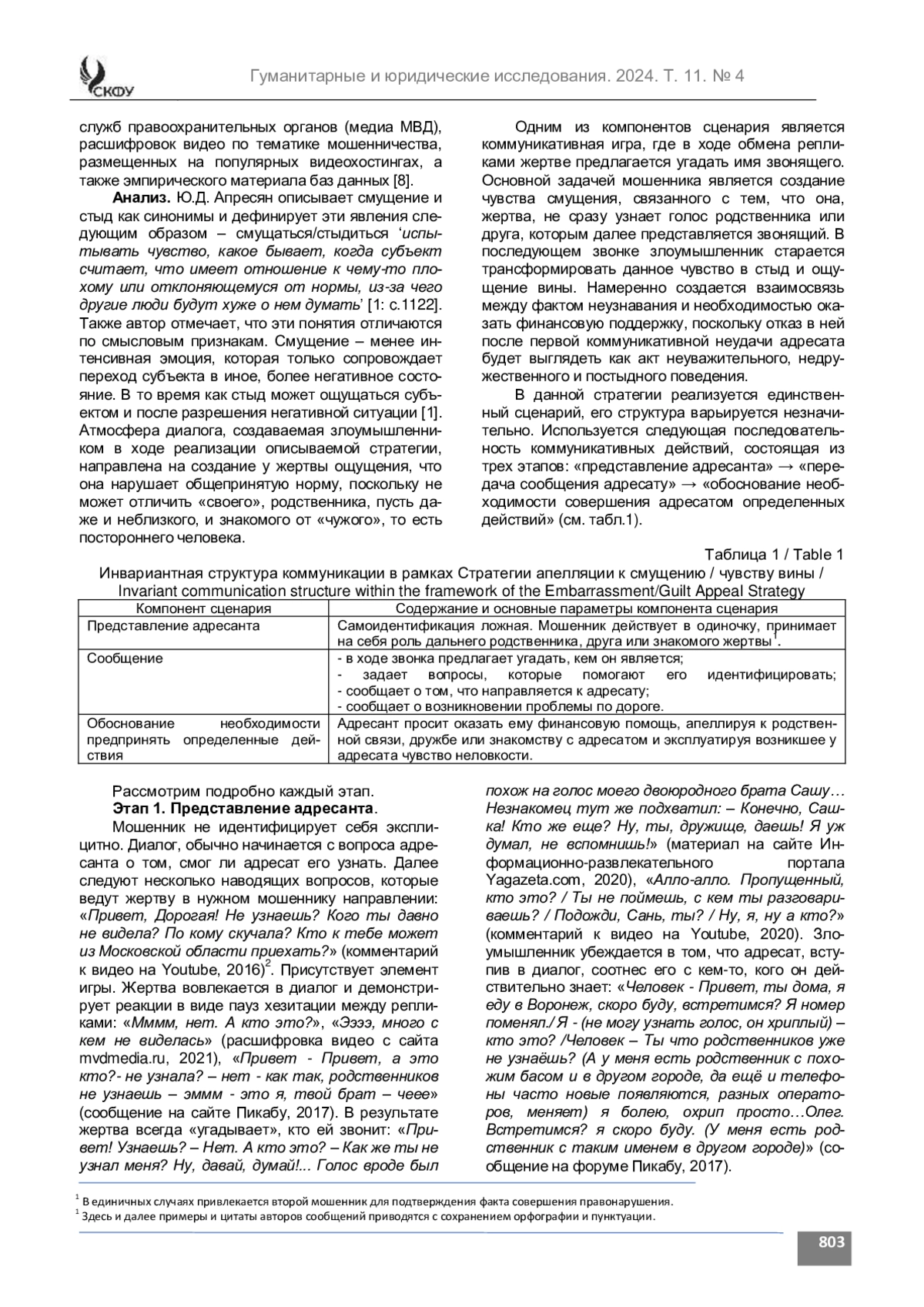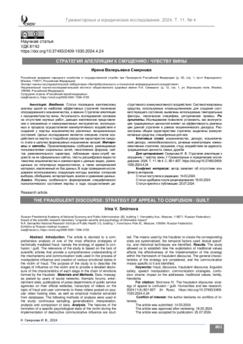 Введение. Статья посвящена комплексному анализу одной из наиболее эффективных стратегий технически опосредованного мошенничества, а именно Стратегии апелляции к смущению/чувству вины. Актуальность исследования основана на отсутствии научных работ, дающих комплексное представление о механизмах и коммуникативных инструментах, используемых в процессе осуществления манипулятивного воздействия и создания у жертвы мошенничества различных эмоциональных состояний. Целью исследования является описание этапов воздействия на жертву и подробное раскрытие характеристик каждого этапа в цепочке формируемых мошенником эмоций.