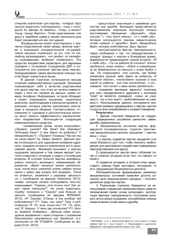 Анализ. Изучены особенности формирования специфического психологического состояния жертвы в ходе осуществления деструктивного коммуникативного воздействия. Систематизированы средства, используемые злоумышленником для создания соответствующего состояния, выявлены используемые темпоральные факторы, лексическая специфика, риторические приемы.