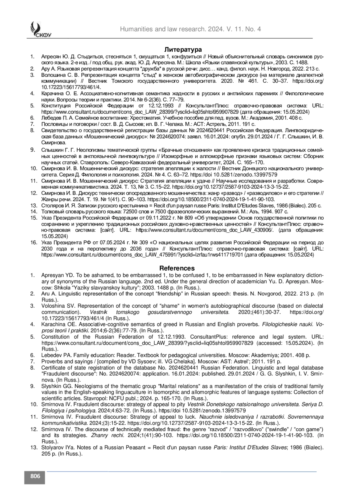 11. Смирнова И. В. Мошеннический дискурс: Стратегия апелляции к удаче // Научные исследования и разработки. Современная коммуникативистика. 2024. Т. 13, № 3. С.15-22. https://doi.org/10.12737/2587-9103-2024-13-3-15-22.