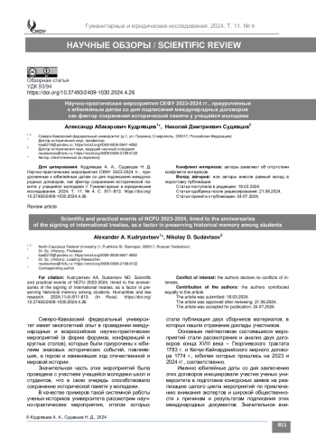 Для цитирования: Кудрявцев А. А., Судавцов Н. Д. Научно-практические мероприятия СКФУ 2023-2024 гг., приуроченные к юбилейным датам со дня подписания международных договоров, как фактор сохранения исторической памяти у учащейся молодежи. Гуманитарные и юридические исследования. 2024;11(4):811-813. https://doi. org/10.37493/2409-1030.2024.4.26