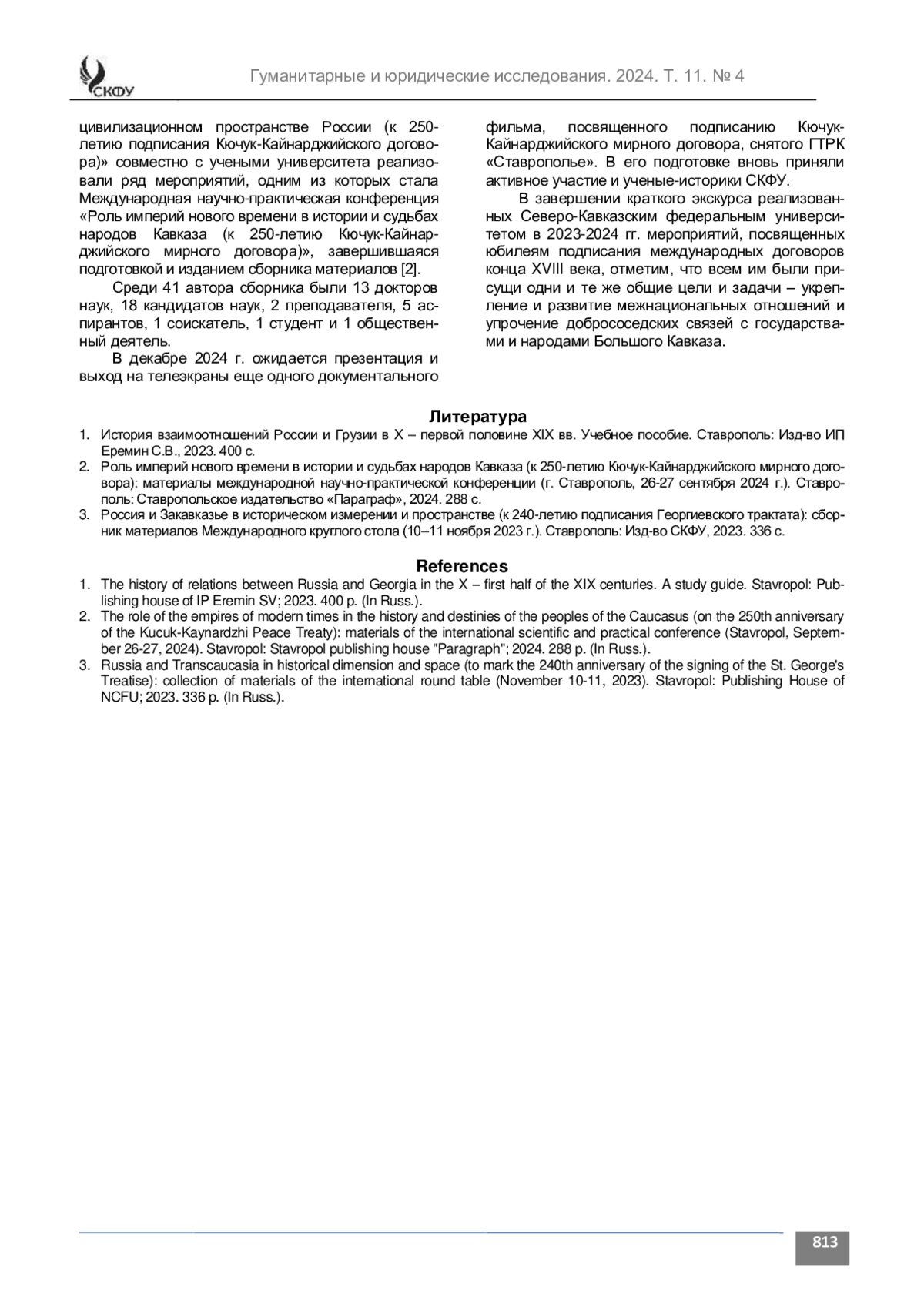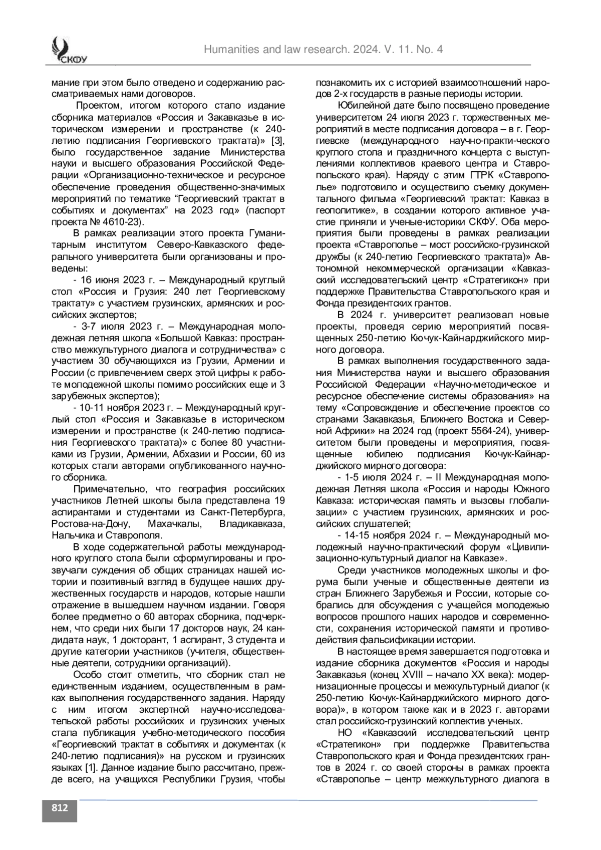 3. Россия и Закавказье в историческом измерении и пространстве (к 240-летию подписания Георгиевского трактата): сборник материалов Международного круглого стола (10-11 ноября 2023 г.). Ставрополь: Изд-во СКФУ, 2023. 336 с.