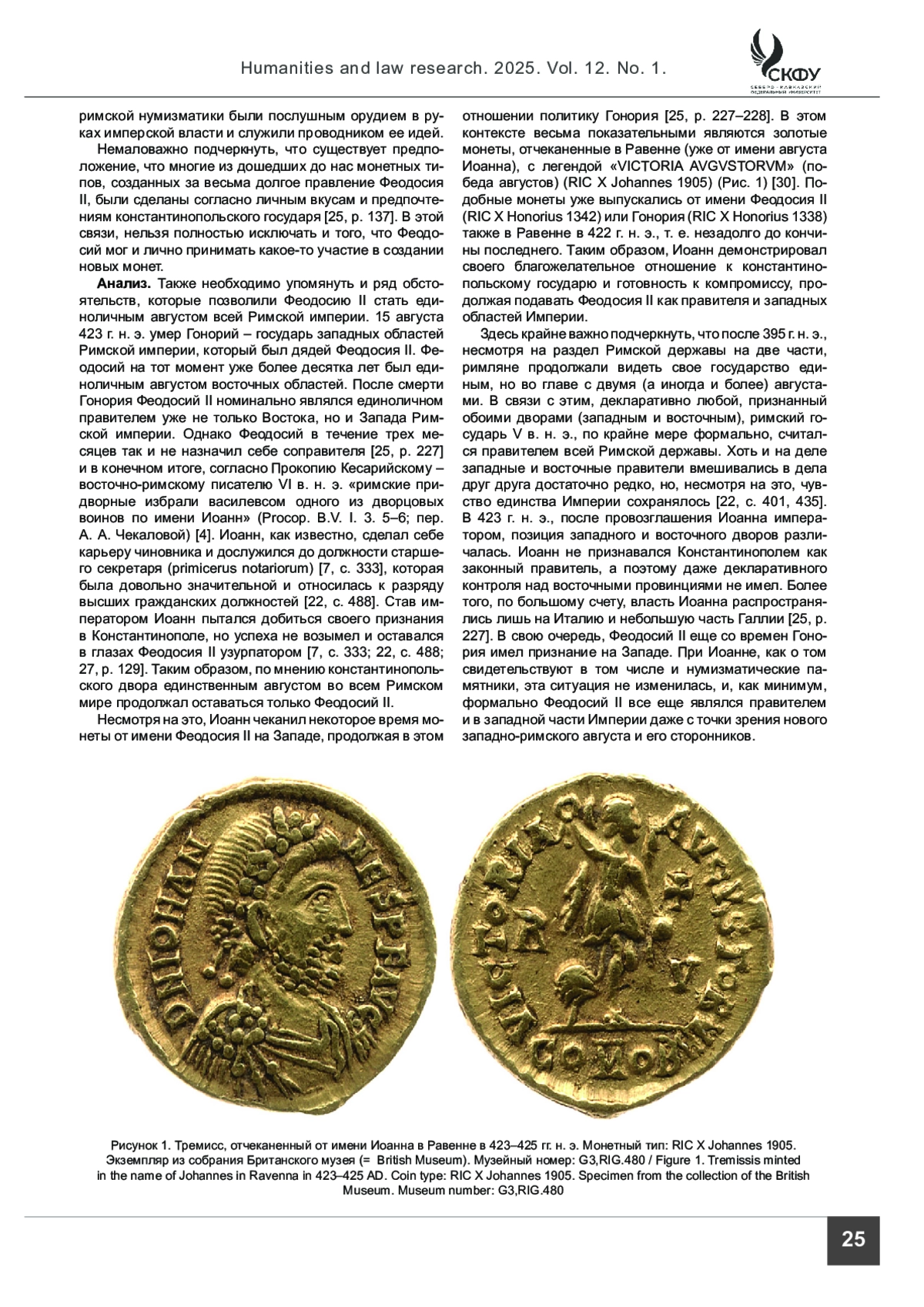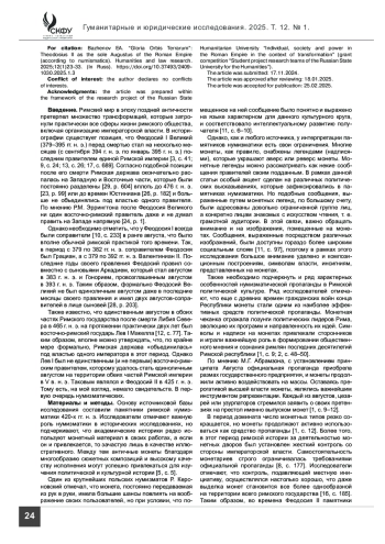 Материалы и методы. В рамках работы были использованы общенаучные методы исследования таких как: анализ, синтез, дедукция. Был применен индуктивный метод, историко-генетический метод. Историко-типологический метод позволил выделить консульские образы на монетах Феодосия II и Валентиниана III. В рамках историко-сравнительного метода производилось сопоставление образов и символов в монетной чеканке. Также стоит отметить, что в рамках статьи производилось сопоставление данных нумизматики с письменными историческими источниками.