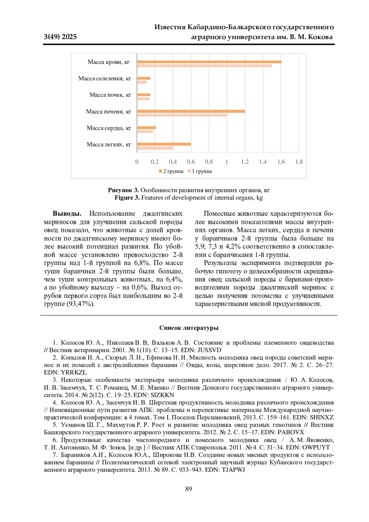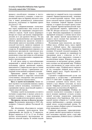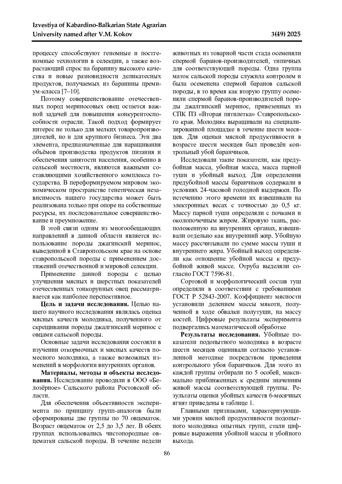 2. 	Копылов И. А., Скорых Л. Н., Ефимова Н. И. Мясность молодняка овец породы советский меринос и их помесей с австралийскими баранами // Овцы, козы, шерстяное дело. 2017. № 2. С. 26-27. EDN: YRRKZL