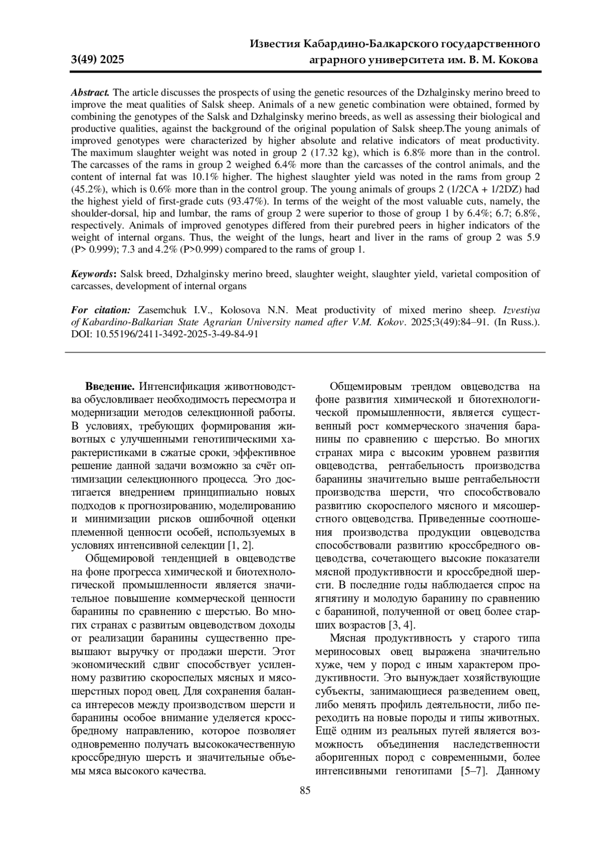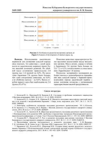 В статье рассматривается перспективность использования генетических ресурсов породы джалгинский меринос для повышения мясных качеств овец сальской породы. Получены животные новой генетической комбинации, сформированной путем объединения генотипов пород сальский и джалгинский меринос. Дана оценка их биологических и продуктивных качеств на фоне исходной популяции сальских овец. Молодняк улучшенных генотипов характеризовался более высокими абсолютными и относительными показателями мясной продуктивности. Максимальная убойная масса отмечена у помесного молодняка (1/2СА+1/2ДЖ) (17,32 кг), что на 6,8% больше, чем у чистопородного молодняка сальской породы. Туши помесных баранчиков (1/2СА+1/2ДЖ) весили больше, чем туши чистопородных сальских животных, на 6,4%, а содержание внутреннего жира было выше на 10,1%. Наибольший убойный выход отмечен у помесных баранчиков (1/2СА+1/2ДЖ) (45,2%), что больше, чем у чистопородных сальских ягнят, на 0,6%. Молодняк генотипа (1/2СА+1/2ДЖ) отличался наибольшим выходом отрубов первого сорта (93,47%). По массе наиболее ценных отрубов, a именно лопаточно-спинного, тазобедренного и поясничного, зафиксировано превосходство полукровных баранчиков (оно составило над чистопородными сальскими 6,4; 6,7; 6,8% соответственно). Животные улучшенных генотипов отличались от чистопородных сверстников более высокими показателями массы внутренних органов. Так, масса легких, сердца и печени у полукровных баранчиков (1/2СА+1/2ДЖ) была больше на 5,9 (Р>0,999); 7,3 и 4,2% (Р>0,999) по сравнению с чистопородными баранчиками сальской породы.