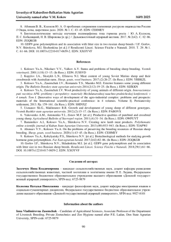 10. 	GDF9 gene polymorphism and its association with litter size in two russian sheep breeds / I.F. Gorlov, N.V. Shirokova, M.I. Slozhenkina [et al.] // Rendiconti Lincei. Scienze Fisiche e Naturali. 2018. Т. 29. № 1. С. 61-66. DOI: 10.1007/s12210-017-0659-2 EDN: XXOYVF