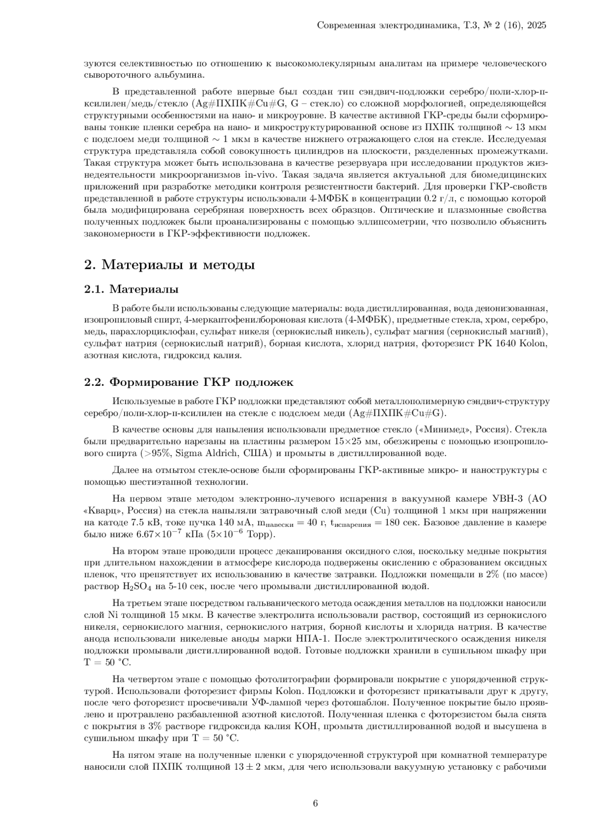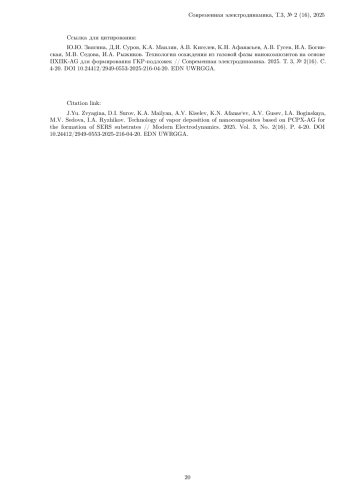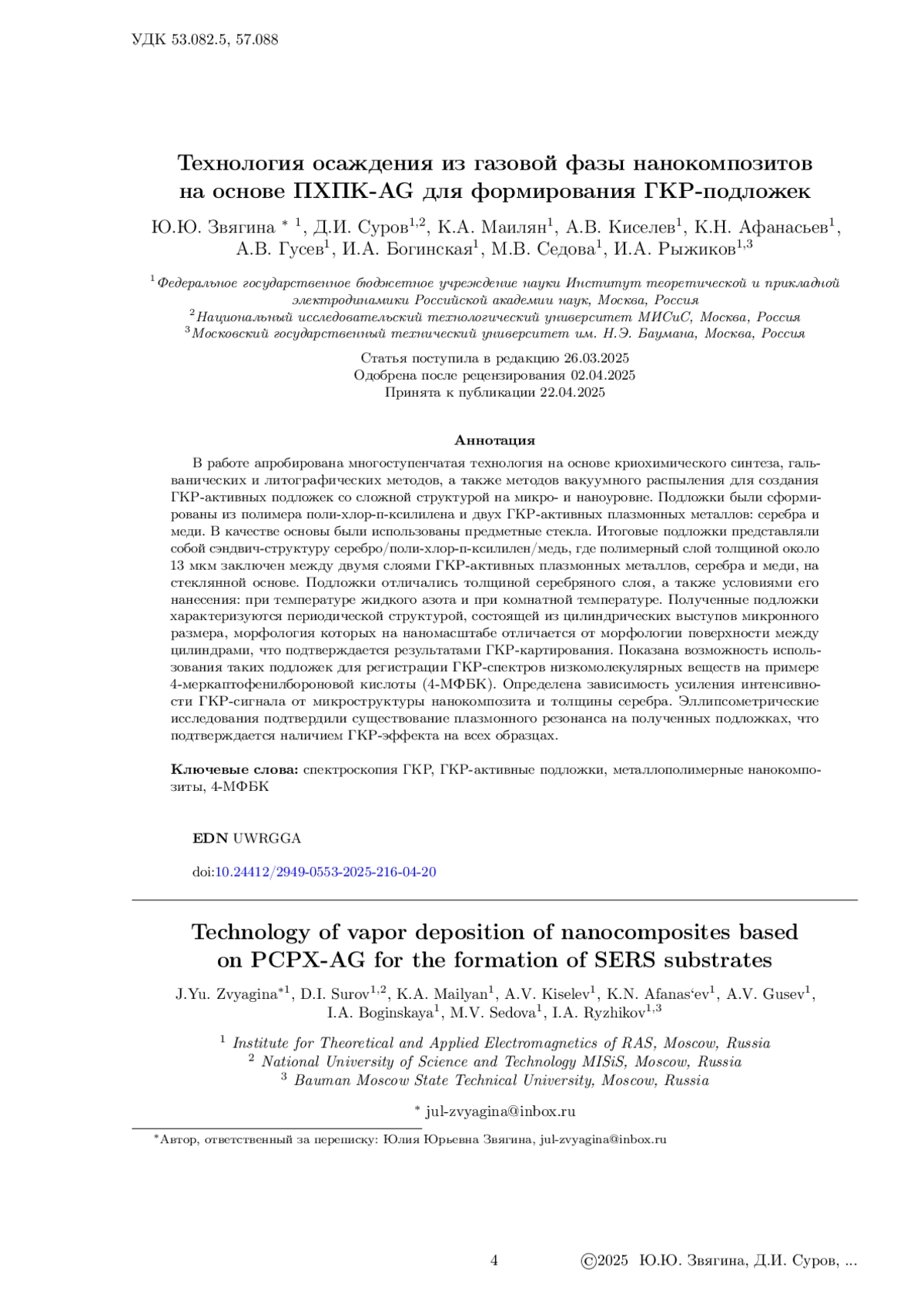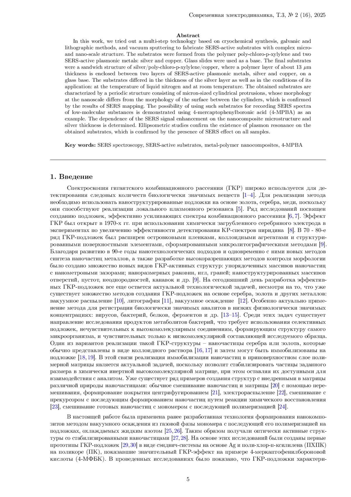 В работе апробирована многоступенчатая технология на основе криохимического синтеза, гальванических и литографических методов, а также методов вакуумного распыления для создания ГКР-активных подложек со сложной структурой на микро- и наноуровне. Подложки были сформированы из полимера поли-хлор-п-ксилилена и двух ГКР-активных плазмонных металлов: серебра и меди. В качестве основы были использованы предметные стекла. Итоговые подложки представляли собой сэндвич-структуру серебро/поли-хлор-п-ксилилен/медь, где полимерный слой толщиной около 13 мкм заключен между двумя слоями ГКР-активных плазмонных металлов, серебра и меди, на стеклянной основе. Подложки отличались толщиной серебряного слоя, а также условиями его нанесения: при температуре жидкого азота и при комнатной температуре. Полученные подложки характеризуются периодической структурой, состоящей из цилиндрических выступов микронного размера, морфология которых на наномасштабе отличается от морфологии поверхности между цилиндрами, что подтверждается результатами ГКР-картирования. Показана возможность использования таких подложек для регистрации ГКР-спектров низкомолекулярных веществ на примере 4-меркаптофенилбороновой кислоты (4-МФБК). Определена зависимость усиления интенсивности ГКР-сигнала от микроструктуры нанокомпозита и толщины серебра. Эллипсометрические исследования подтвердили существование плазмонного резонанса на полученных подложках, что подтверждается наличием ГКР-эффекта на всех образцах.