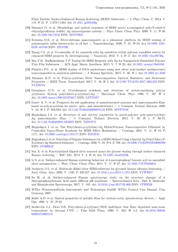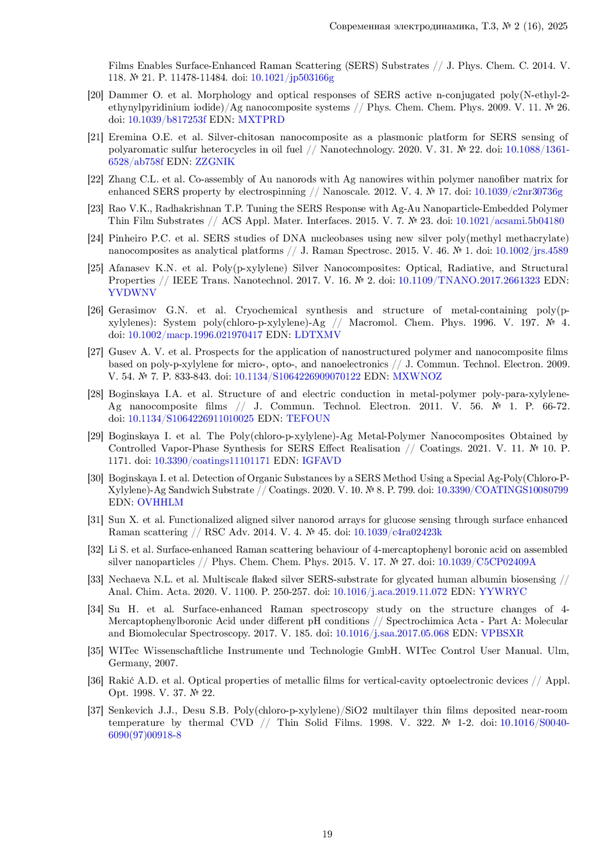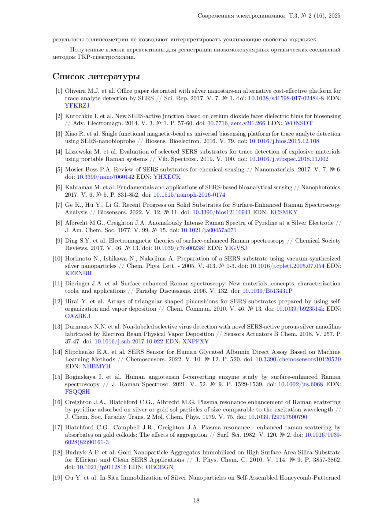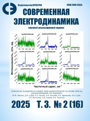 В работе апробирована многоступенчатая технология на основе криохимического синтеза, гальванических и литографических методов, а также методов вакуумного распыления для создания ГКР-активных подложек со сложной структурой на микро- и наноуровне. Подложки были сформированы из полимера поли-хлор-п-ксилилена и двух ГКР-активных плазмонных металлов: серебра и меди. В качестве основы были использованы предметные стекла. Итоговые подложки представляли собой сэндвич-структуру серебро/поли-хлор-п-ксилилен/медь, где полимерный слой толщиной около 13 мкм заключен между двумя слоями ГКР-активных плазмонных металлов, серебра и меди, на стеклянной основе. Подложки отличались толщиной серебряного слоя, а также условиями его нанесения: при температуре жидкого азота и при комнатной температуре. Полученные подложки характеризуются периодической структурой, состоящей из цилиндрических выступов микронного размера, морфология которых на наномасштабе отличается от морфологии поверхности между цилиндрами, что подтверждается результатами ГКР-картирования. Показана возможность использования таких подложек для регистрации ГКР-спектров низкомолекулярных веществ на примере 4-меркаптофенилбороновой кислоты (4-МФБК). Определена зависимость усиления интенсивности ГКР-сигнала от микроструктуры нанокомпозита и толщины серебра. Эллипсометрические исследования подтвердили существование плазмонного резонанса на полученных подложках, что подтверждается наличием ГКР-эффекта на всех образцах.