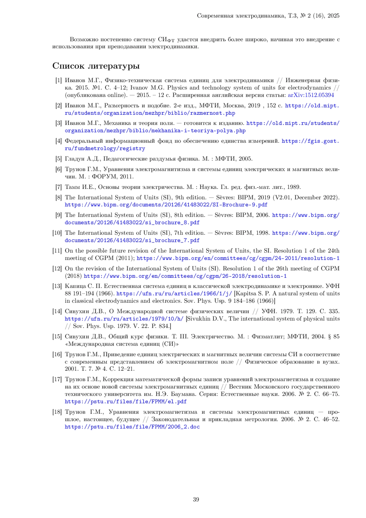 18. Трунов Г.М., Уравнения электромагнетизма и системы электромагнитных единиц - прошлое, настоящее, будущее //Законодательная и прикладная метрология. 2006. № 2. С. 46-52. https://pstu.ru/files/file/FPMM/2006_2.doc.
