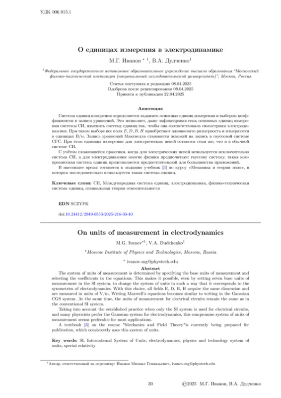 1. Иванов М.Г., Физико-техническая система единиц для электродинамики // Инженерная физика. 2015. №1. С. 4-12; Ivanov M.G. Physics and technology system of units for electrodynamics //(опубликована online). - 2015. - 12 с. Расширенная английская версия статьи: arXiv:1512.05394.