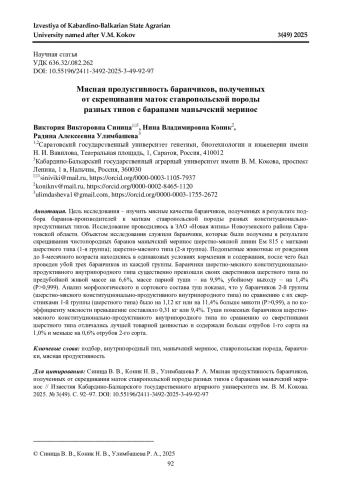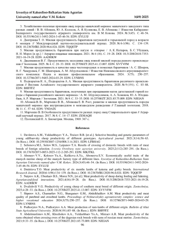 2. Селионова М. И., Сеитов М. С., Лайпанов Т. А. Результаты скрещивания овец отечественных пород с баранами мясных пород зарубежной селекции // Известия Оренбургского государственного аграрного университета. 2025. № 2(112). С. 285-291. DOI: 10.37670/2073-0853-2025-112-2-285-291 EDN: MKJTKL