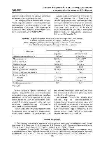 Цель исследования - изучить мясные качества баранчиков, полученных в результате подбора баранов-производителей к маткам ставропольской породы разных конституционально-продуктивных типов. Исследование проводилиось в ЗАО «Новая жизнь» Новоузенского района Саратовской области. Объектом исследования служили баранчики, которые были получены в результате скрещивания чистопородных баранов манычский меринос шерстно-мясной линии Ем 815 с матками шерстного типа (1-я группа); шерстно-мясного типа (2-я группа). Подопытные животные от рождения до 8-месячного возраста находились в одинаковых условиях кормления и содержания, после чего был проведен убой трех баранчиков из каждой группы. Баранчики шерстно-мясного конституционально-продуктивного внутрипородного типа существенно превзошли своих сверстников шерстного типа по предубойной живой массе на 6,6%, массе парной туши - на 9,9%, убойному выходу - на 1,4% (Р>0,999). Анализ морфологического и сортового состава туш показал, что у баранчиков 2-й группы (шерстно-мясного конституционально-продуктивного внутрипородного типа) по сравнению с их сверстниками 1-й группы (шерстного типа) было на 1,12 кг или на 11,4% больше мякоти (Р>0,99), а по коэффициенту мясности превышение составляло 0,31 кг или 9,4%. Туши помесных баранчиков шерстно-мясного конституционально-продуктивного внутрипородного типа по сравнению со сверстниками шерстного типа отличались лучшей товарной ценностью и содержали больше отрубов 1-го сорта на 1,0% и меньше на 0,6% отрубов 2-го сорта.