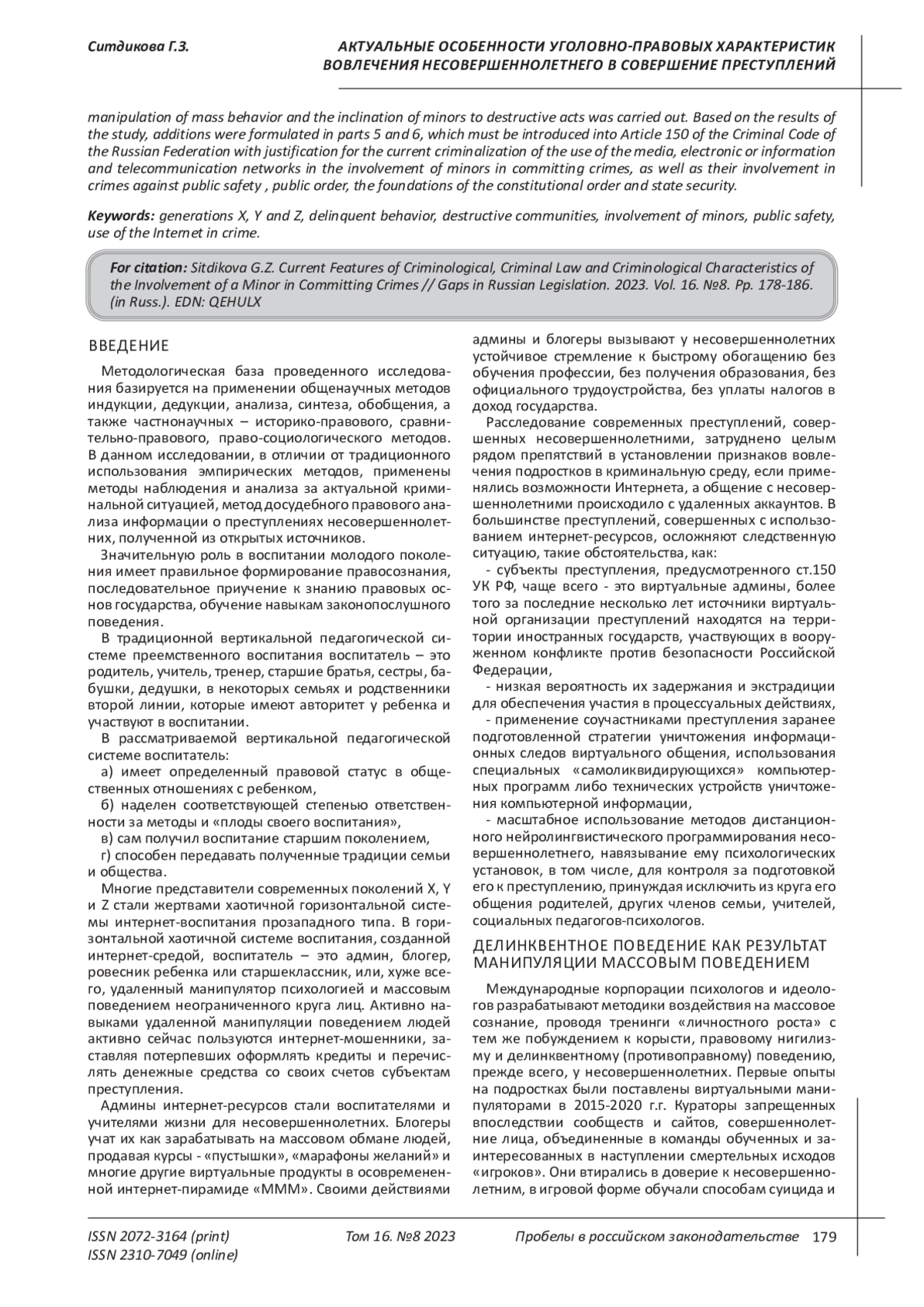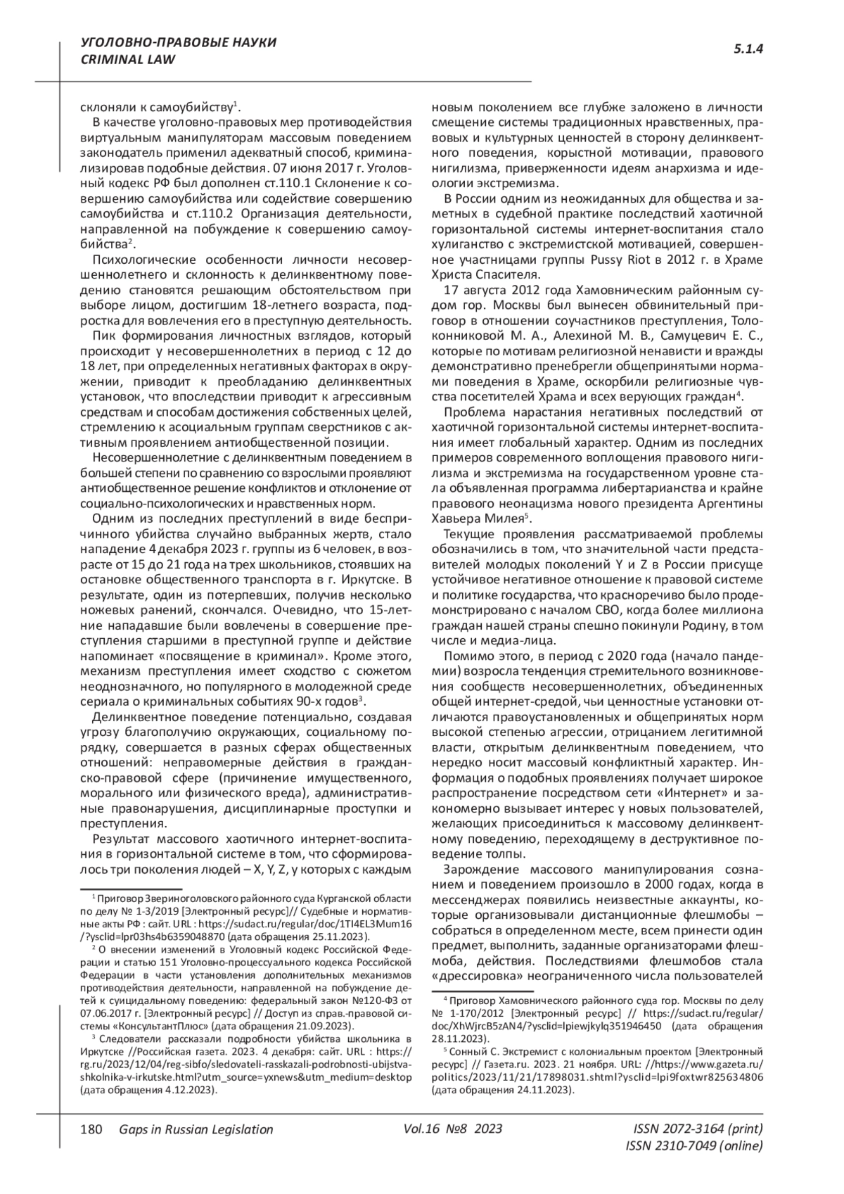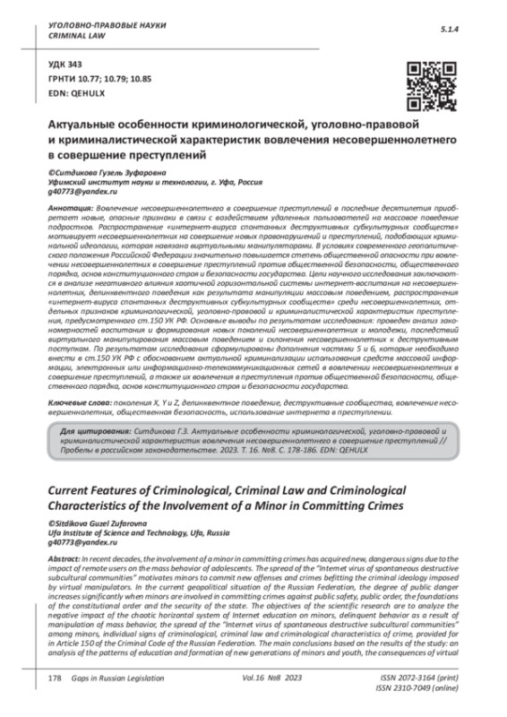 Вовлечение несовершеннолетнего в совершение преступлений в последние десятилетия приобретает новые, опасные признаки в связи с воздействием удаленных пользователей на массовое поведение подростков. Распространение «интернет-вируса спонтанных деструктивных субкультурных сообществ» мотивирует несовершеннолетних на совершение новых правонарушений и преступлений, подобающих криминальной идеологии, которая навязана виртуальными манипуляторами. В условиях современного геополитического положения Российской Федерации значительно повышается степень общественной опасности при вовлечении несовершеннолетних в совершение преступлений против общественной безопасности, общественного порядка, основ конституционного строя и безопасности государства. Цели научного исследования заключаются в анализе негативного влияния хаотичной горизонтальной системы интернет-воспитания на несовершеннолетних, делинквентного поведения как результата манипуляции массовым поведением, распространения «интернет-вируса спонтанных деструктивных субкультурных сообществ» среди несовершеннолетних, отдельных признаков криминологической, уголовно-правовой и криминалистической характеристик преступления, предусмотренного ст.150 УК РФ. Основные выводы по результатам исследования: проведен анализ закономерностей воспитания и формирования новых поколений несовершеннолетних и молодежи, последствий виртуального манипулирования массовым поведением и склонения несовершеннолетних к деструктивным поступкам. По результатам исследования сформулированы дополнения частями 5 и 6, которые необходимо внести в ст.150 УК РФ с обоснованием актуальной криминализации использования средств массовой информации, электронных или информационно-телекоммуникационных сетей в вовлечении несовершеннолетних в совершение преступлений, а также их вовлечения в преступления против общественной безопасности, общественного порядка, основ конституционного строя и безопасности государства.