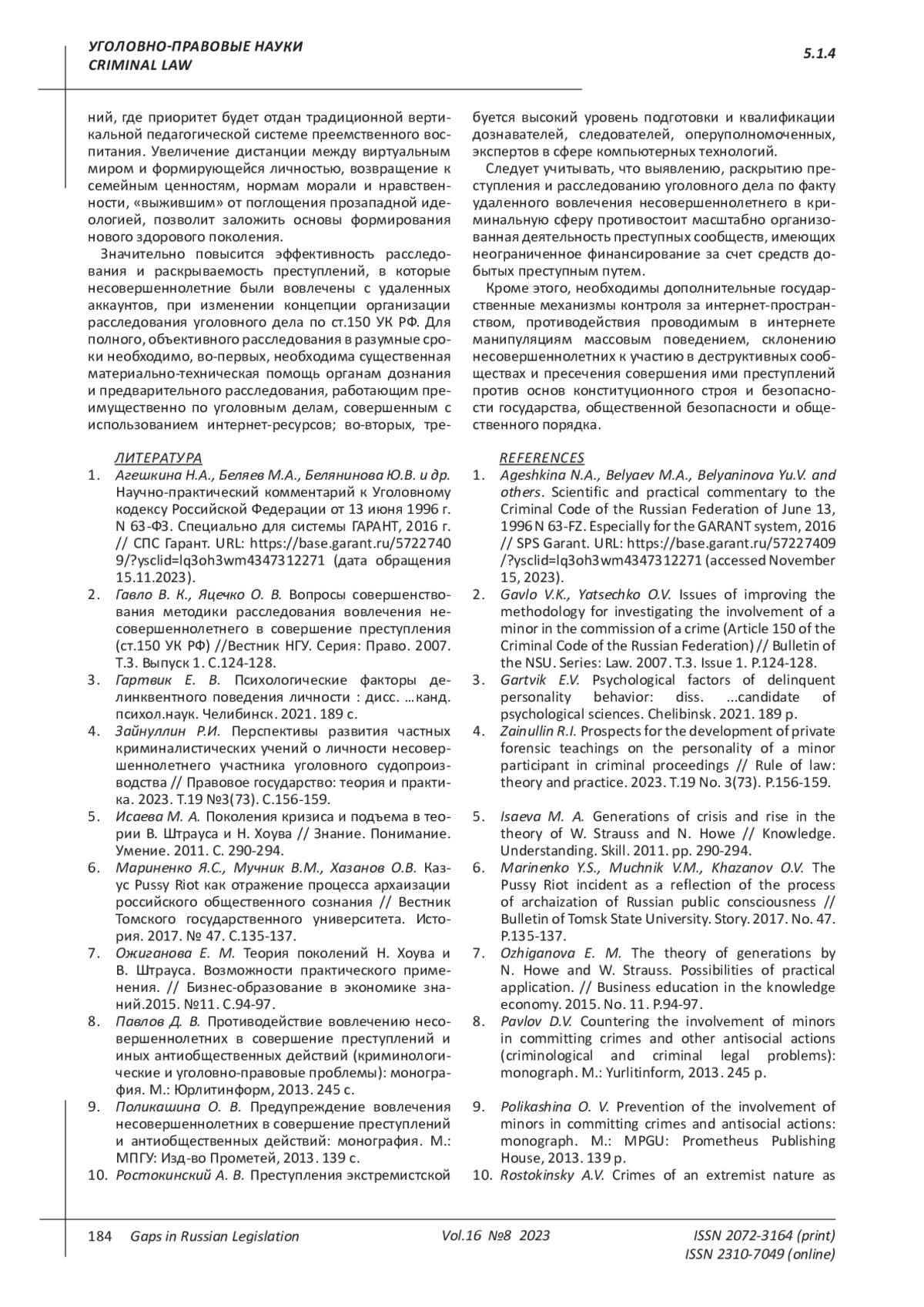 4. Зайнуллин Р.И. Перспективы развития частных криминалистических учений о личности несовершеннолетнего участника уголовного судопроизводства // Правовое государство: теория и практика. 2023. Т.19 №3(73). С.156-159. EDN: VQFWIT