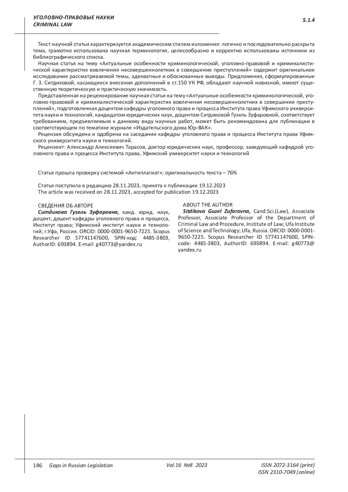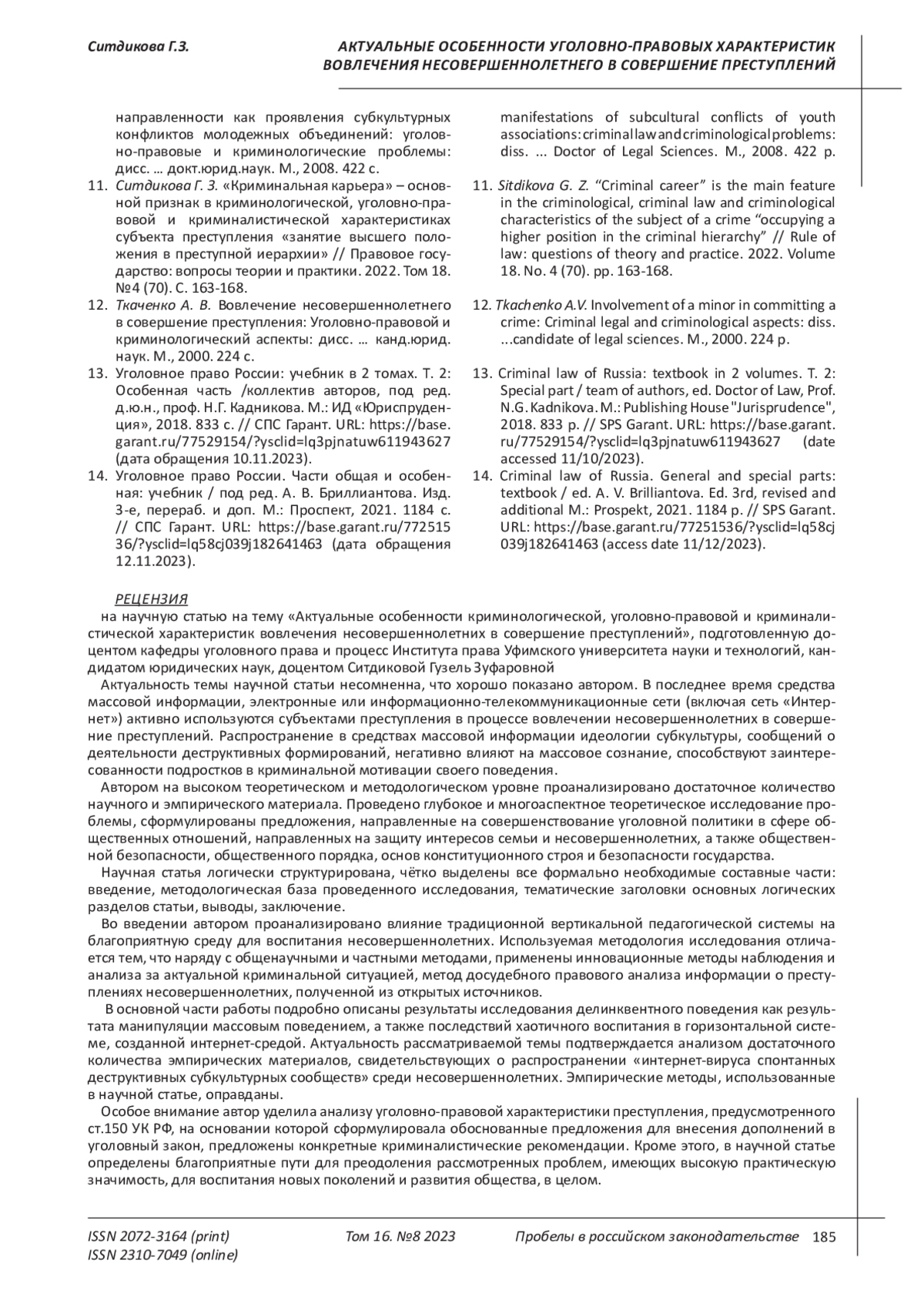11. Ситдикова Г. З. “Криминальная карьера” - основной признак в криминологической, уголовно-правовой и криминалистической характеристиках субъекта преступления “занятие высшего положения в преступной иерархии” // Правовое государство: теория и практика. 2022. Том 18. №4 (70). С. 163-168. EDN: QWAPTO