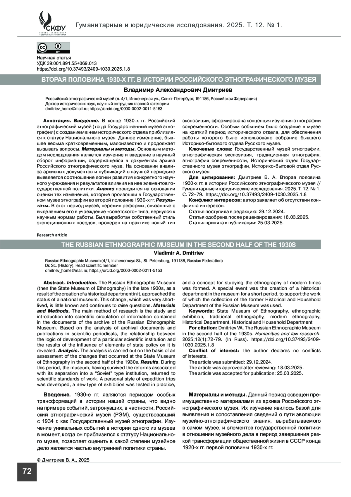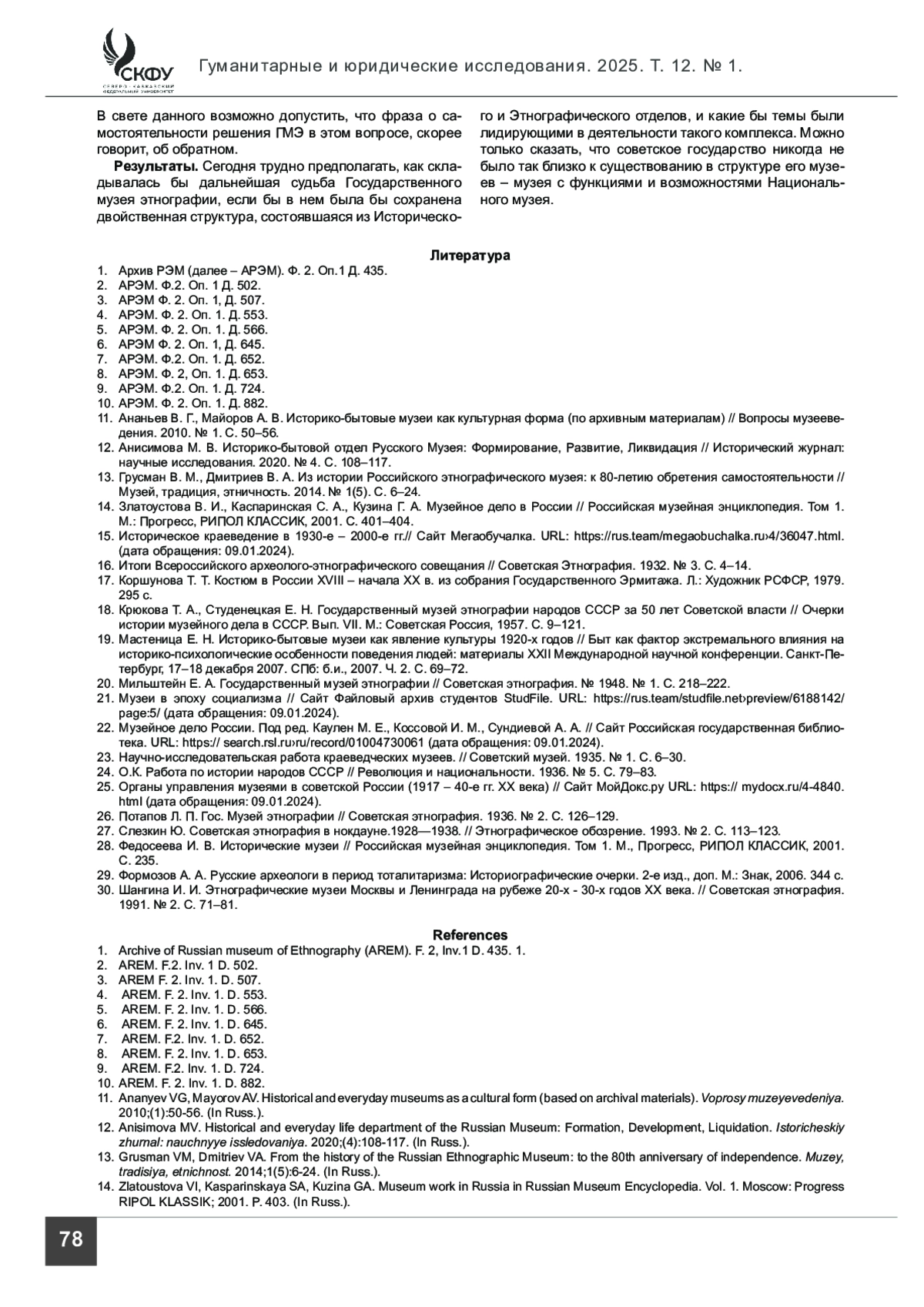 13. Грусман В. М., Дмитриев В. А. Из истории Российского этнографического музея: к 80-летию обретения самостоятельности // Музей, традиция, этничность. 2014. № 1(5). С. 6-24.