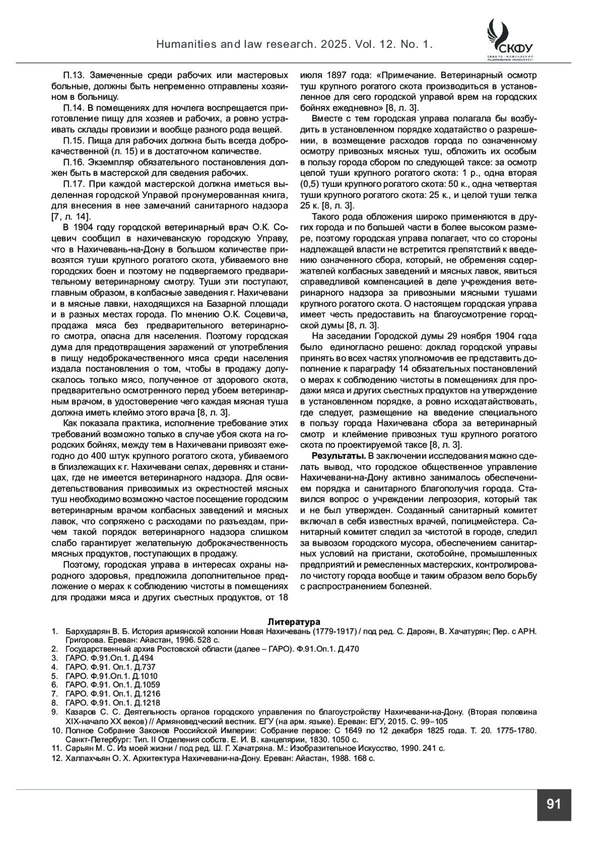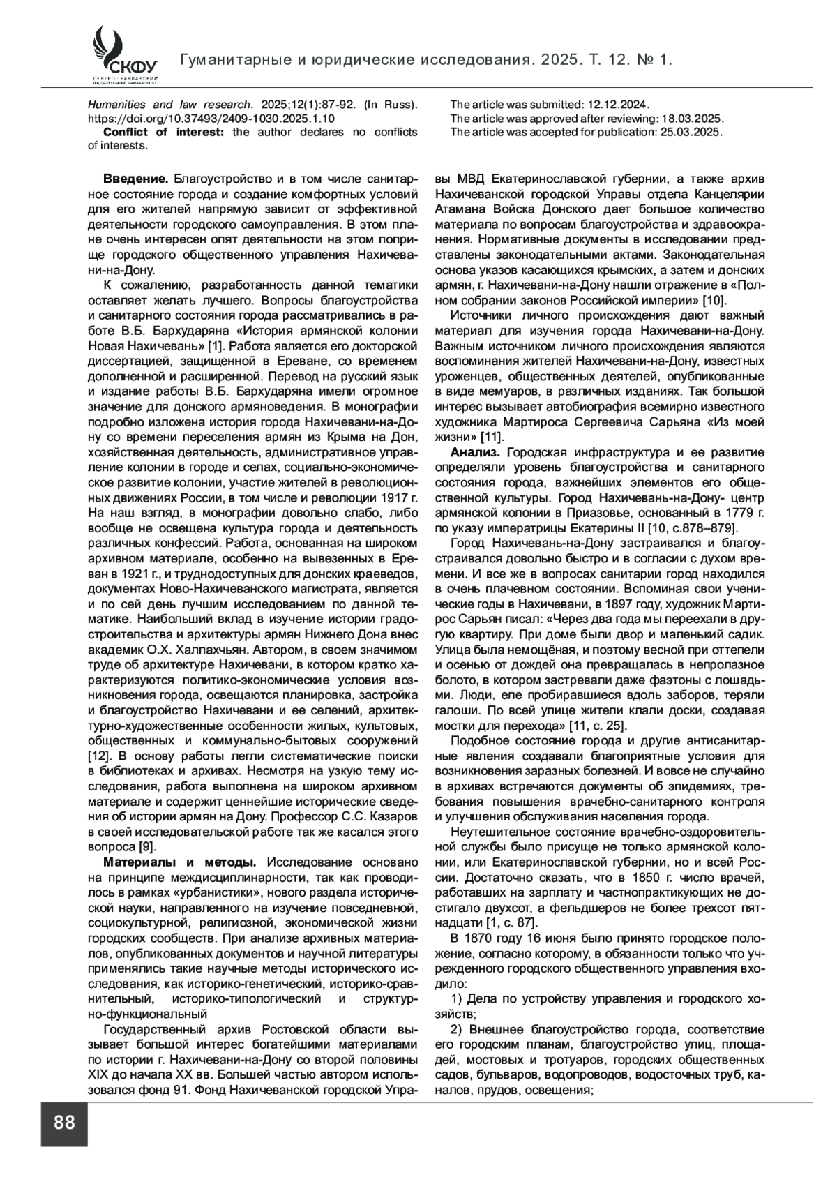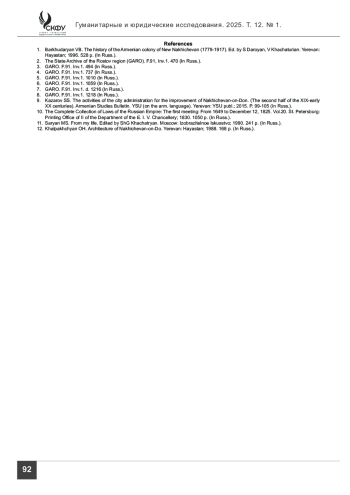 9. Казаров С. С. Деятельность органов городского управления по благоустройству Нахичевани-на-Дону. (Вторая половина XIX-начало ХХ веков) // Армяноведческий вестник. ЕГУ (на арм. языке). Ереван: ЕГУ, 2015. С. 99-105