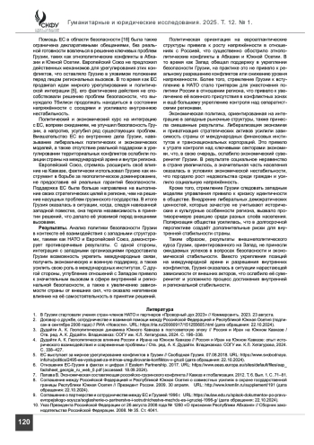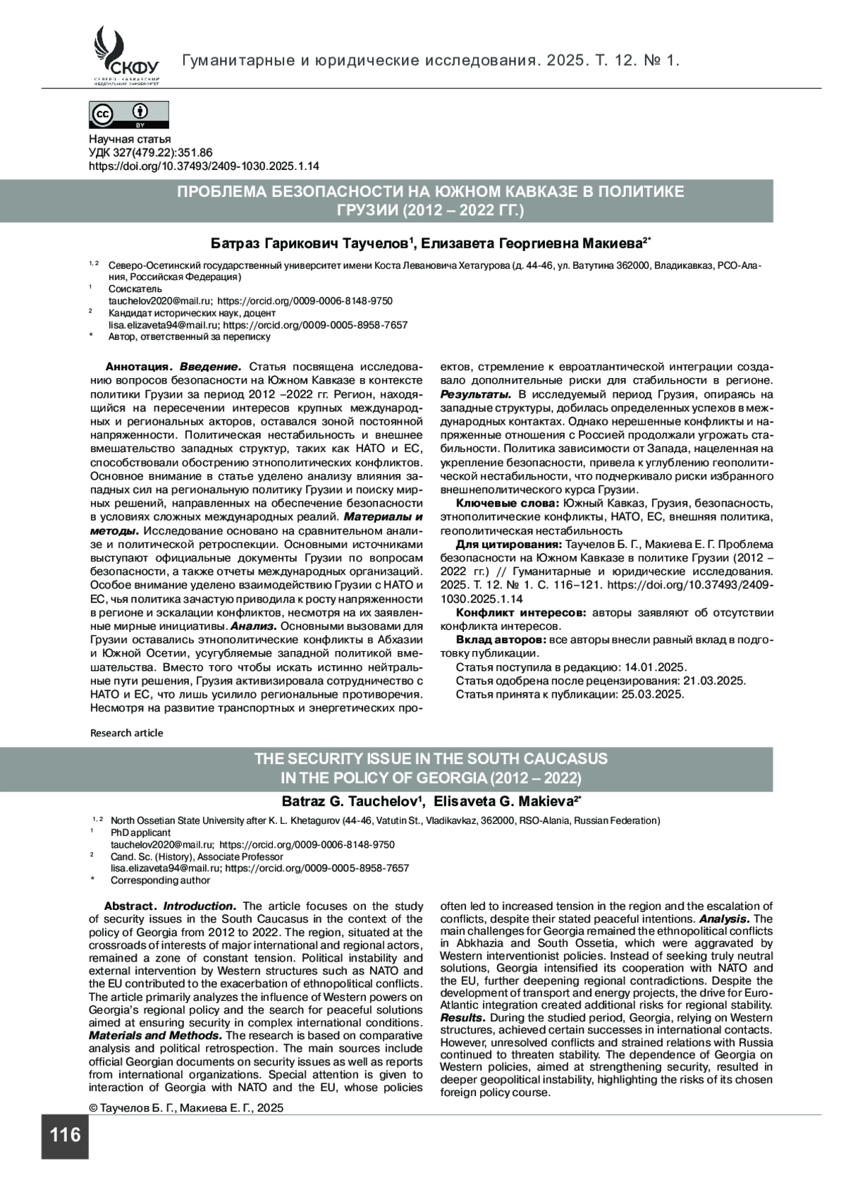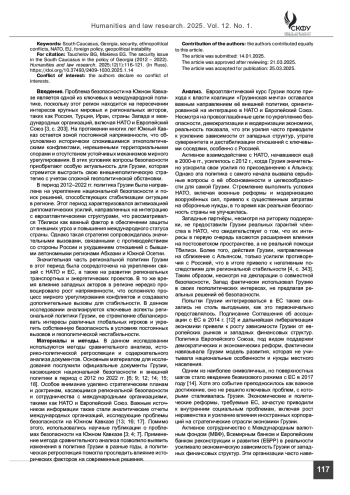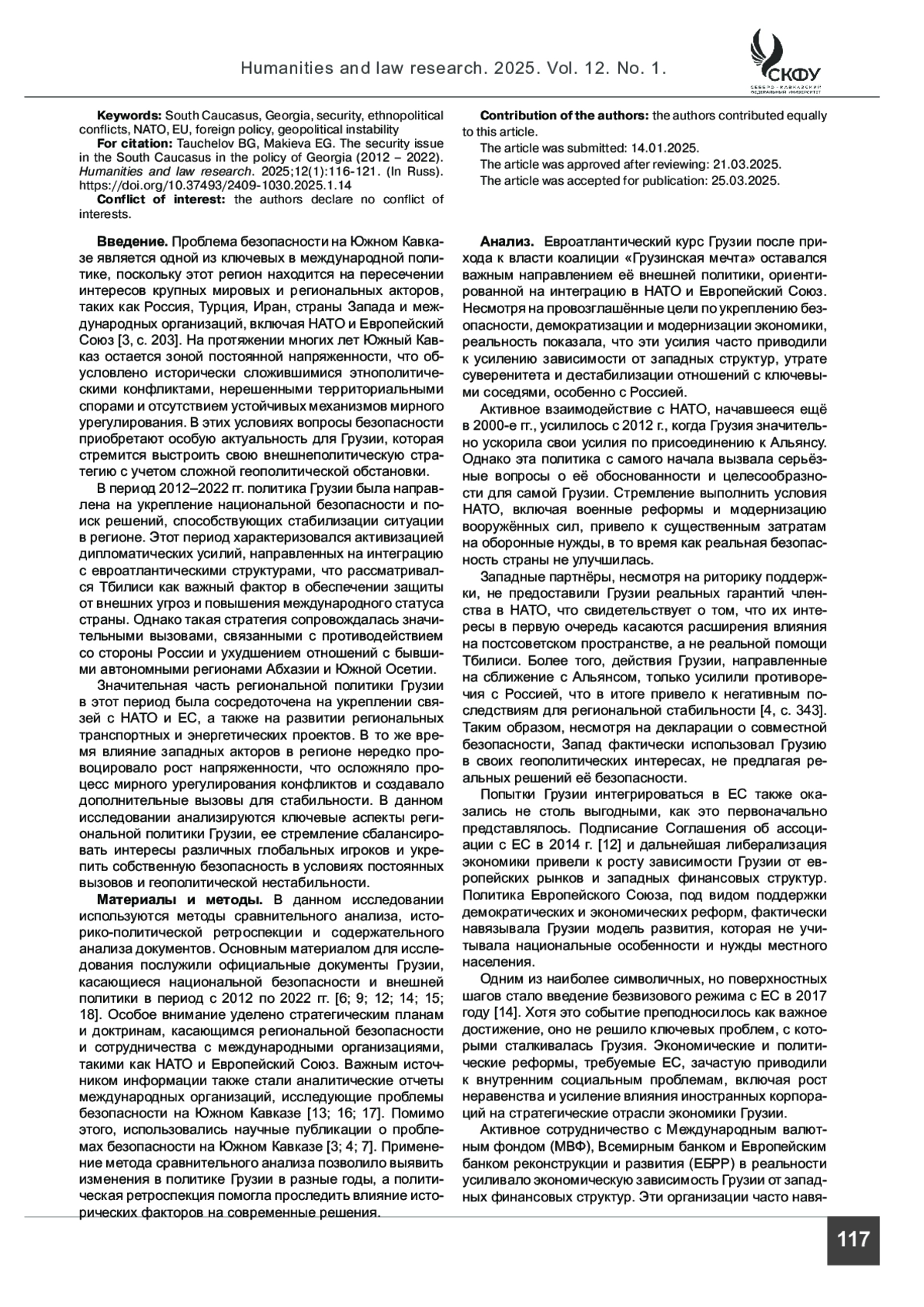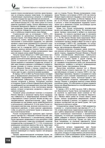 Введение. Статья посвящена исследованию вопросов безопасности на Южном Кавказе в контексте политики Грузии за период 2012 –2022 гг. Регион, находящийся на пересечении интересов крупных международных и региональных акторов, оставался зоной постоянной напряженности. Политическая нестабильность и внешнее вмешательство западных структур, таких как НАТО и ЕС, способствовали обострению этнополитических конфликтов. Основное внимание в статье уделено анализу влияния западных сил на региональную политику Грузии и поиску мирных решений, направленных на обеспечение безопасности в условиях сложных международных реалий.