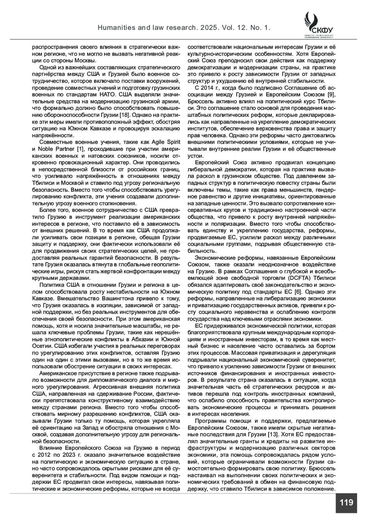 Результаты. В исследуемый период Грузия, опираясь на западные структуры, добилась определенных успехов в международных контактах. Однако нерешенные конфликты и напряженные отношения с Россией продолжали угрожать стабильности. Политика зависимости от Запада, нацеленная на укрепление безопасности, привела к углублению геополитической нестабильности, что подчеркивало риски избранного внешнеполитического курса Грузии.