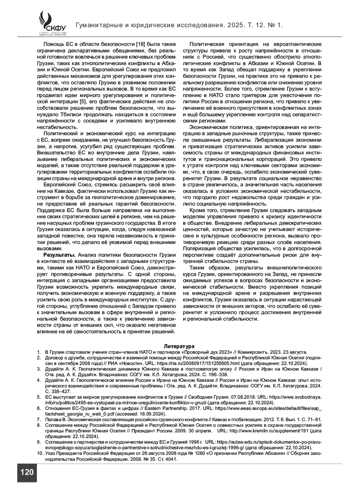 4. Дудайти А. К. Геополитическое влияние России и Ирана на Южном Кавказе // Россия и Иран на Южном Кавказе: опыт исторического взаимодействия и современные проблемы / Отв. ред. А. К. Дудайти. Владикавказ: СОГУ им. К.Л. Хетагурова, 2024. С. 338-427.
