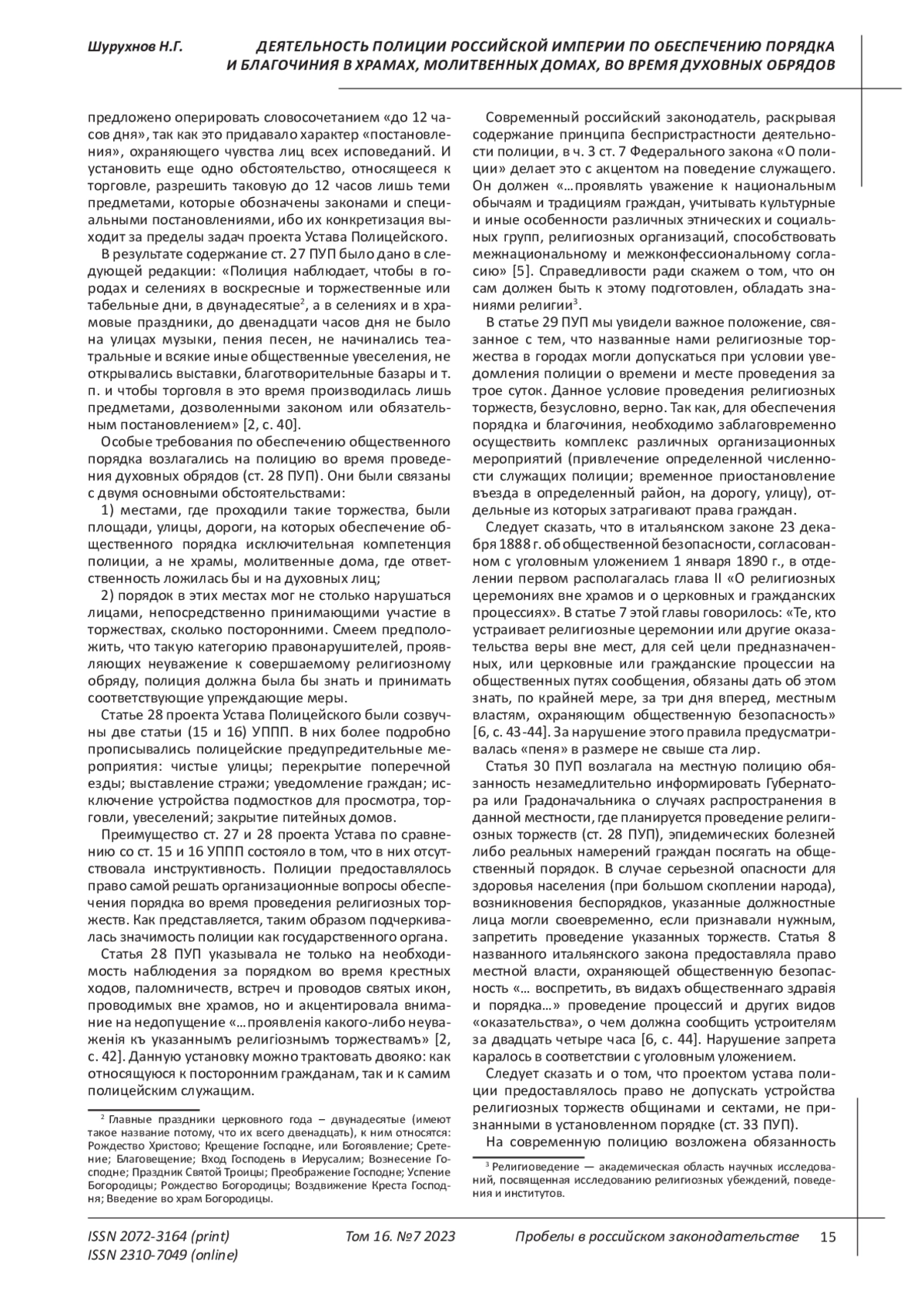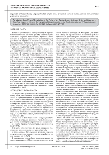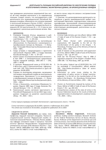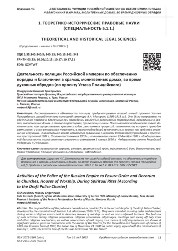 Рассматриваются обязанности полиции, предусмотренные второй главой проекта Устава Полицейского, разработанного комиссией сенатора А. А. Макарова (1906-1913 гг.). Они были направлены на обеспечение порядка и благочиния при проведении различных религиозных мероприятий, проводимых в храмах, молитвенных домах, а также территориях, прилегающих к ним. Показываются особенности такой деятельности при осуществлении крестных ходов, религиозных процессий, паломничеств, встреч и проводов святых икон и иных религиозных торжеств, а также наблюдений за колокольным звоном как средства оповещения верующих. Значительное место отводится сравнению с нормами Устава предупреждения и пресечения преступлений 1882 г., Уголовного Уложения 1903 г., итальянского закона 23 декабря 1888 г. об общественной безопасности, согласованного с уголовным уложением 1 января 1890 г, Федерального закона Российской Федерации «О полиции».