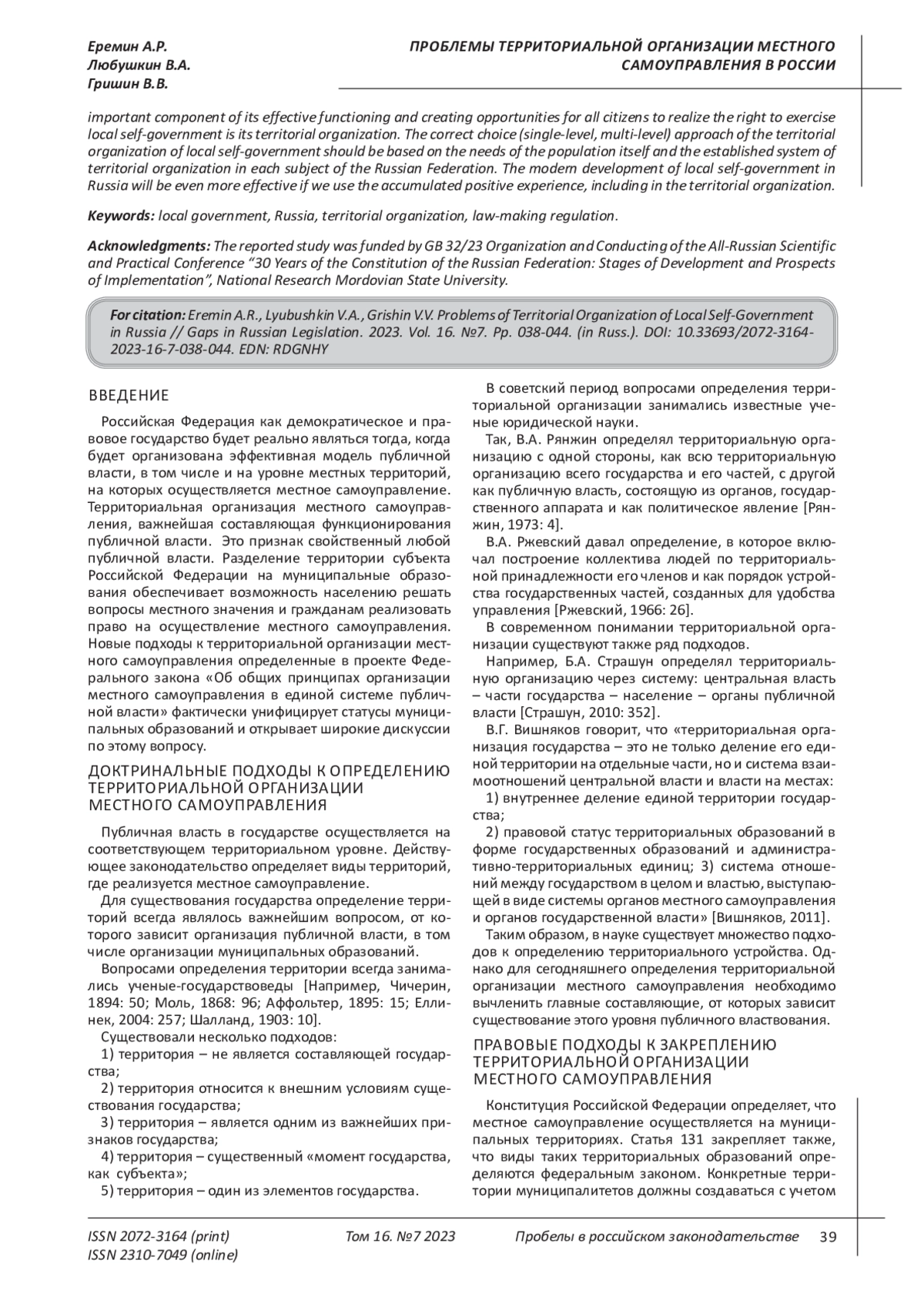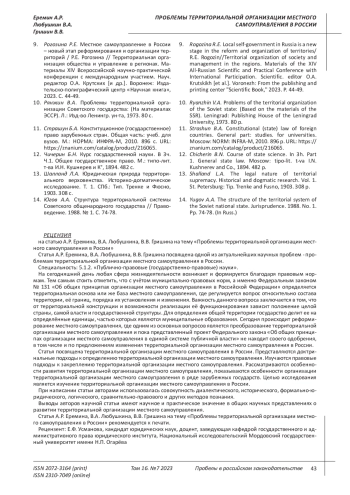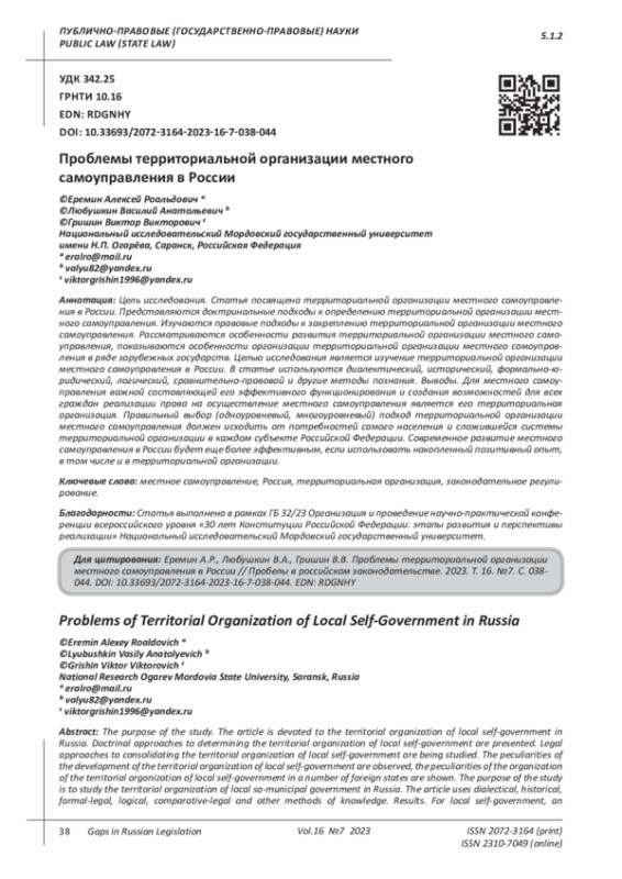 Rogozina R.E. Local self-government in Russia is a new stage in the reform and organization of territories/R.E. Rogozin//Territorial organization of society and management in the regions. Materials of the XIV All-Russian Scientific and Practical Conference with International Participation. Scientific. editor O.A. Krutskikh [et al.]. Voronezh: From the publishing and printing center “Scientific Book”, 2023. P. 44-49. EDN: VSGXZT