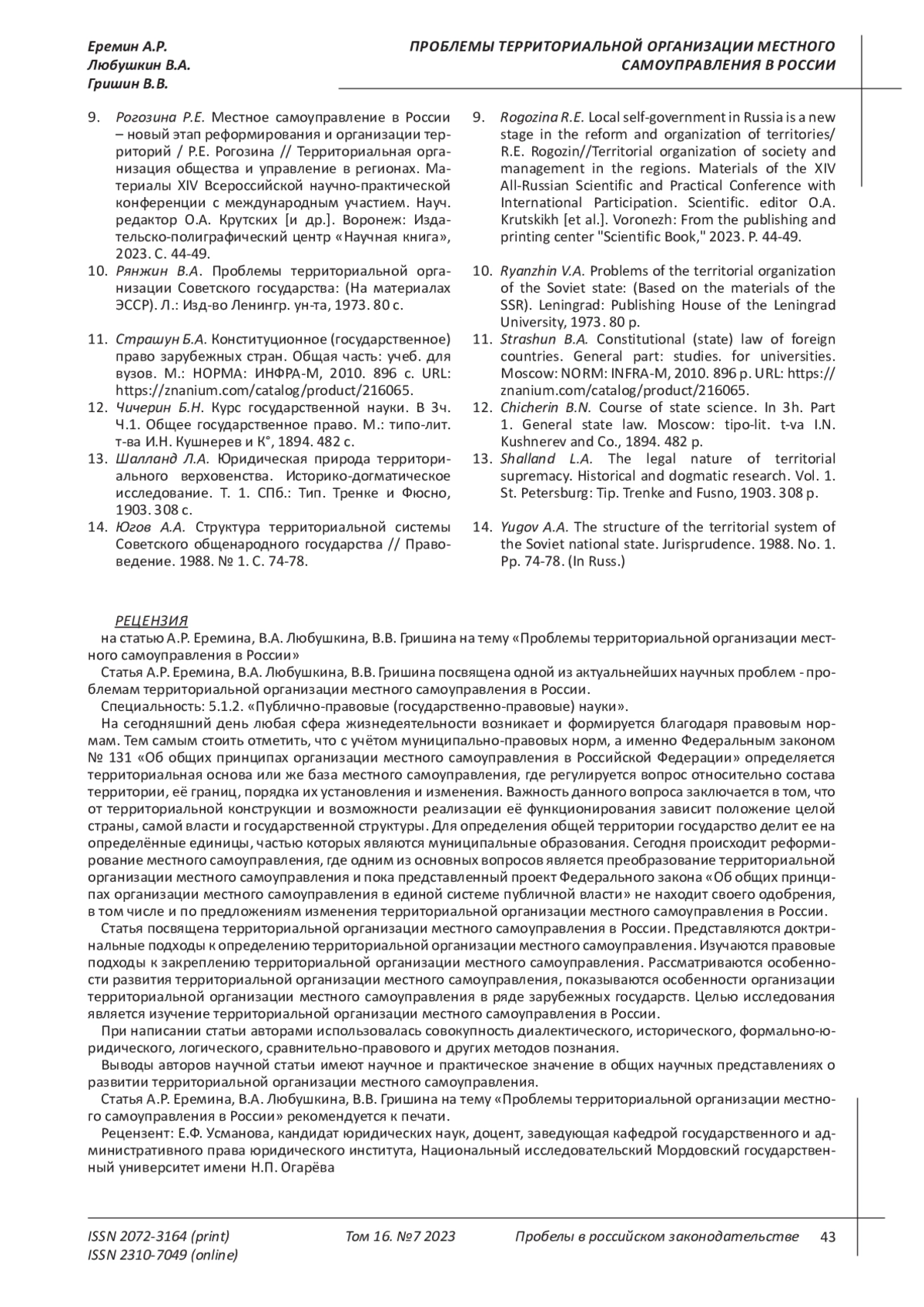 9. 	Рогозина Р.Е. Местное самоуправление в России - новый этап реформирования и организации территорий / Р.Е. Рогозина // Территориальная организация общества и управление в регионах. Материалы ХIV Всероссийской научно-практической конференции с международным участием. Науч. редактор О.А. Крутских [и др.]. Воронеж: Издательско-полиграфический центр “Научная книга”, 2023. С. 44-49. EDN: VSGXZT
