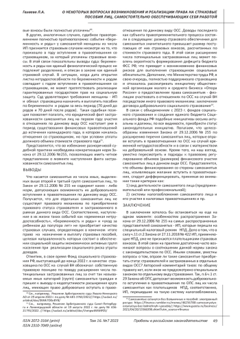 Статья посвящена особенностям правовой регламентации социально - обеспечительных отношений с участием лиц, самостоятельно обеспечивающих себя работой, в частности, отношений, связанных с назначением страховых пособий как вида социально- обеспечительных предоставлений в праве социального обеспечения. Цели и задачи заявленной темы исследования разрешаются в контексте авторской классификации самозанятых лиц, которая произведена со ссылкой на действующее российское законодательство. Анализируются особенности правоотношений по обязательному социальному страхованию на случай временной нетрудоспособности и в связи с материнством с участием лиц, самостоятельно обеспечивающих себя работой в рамках Закона от 29. 12.2006 г. № 255-ФЗ. Акцентируется внимание на проблеме определения момента возникновения юридического факта застрахованности самозанятых лиц. Анализируется судебная практика, связанная с определением права на страховые пособия в первом календарном году вступления самозанятых в правоотношения по данному виду обязательного социального страхования. В результате исследования автор приходит к выводу о необходимости совершенствования законодательства с целью создания правовых условий для распространения упомянутого закона на иные категории (группы) самозанятых лиц, в частности на лиц, выступающих в качестве плательщиков налога на профессиональный доход.