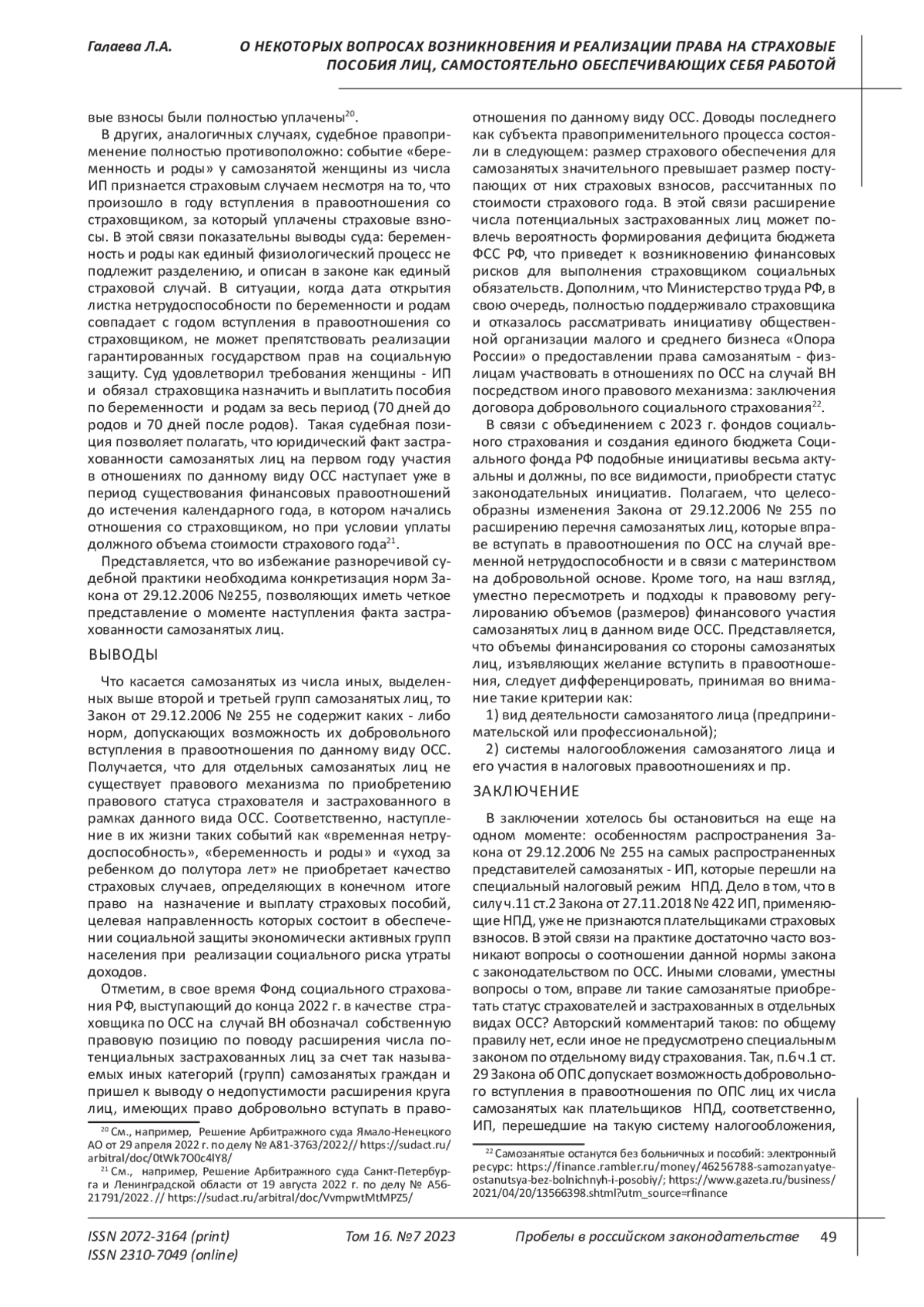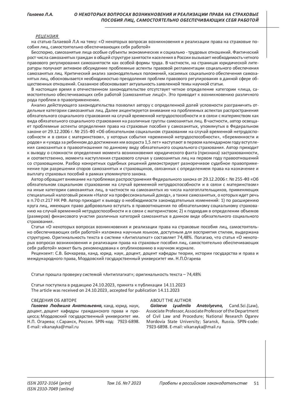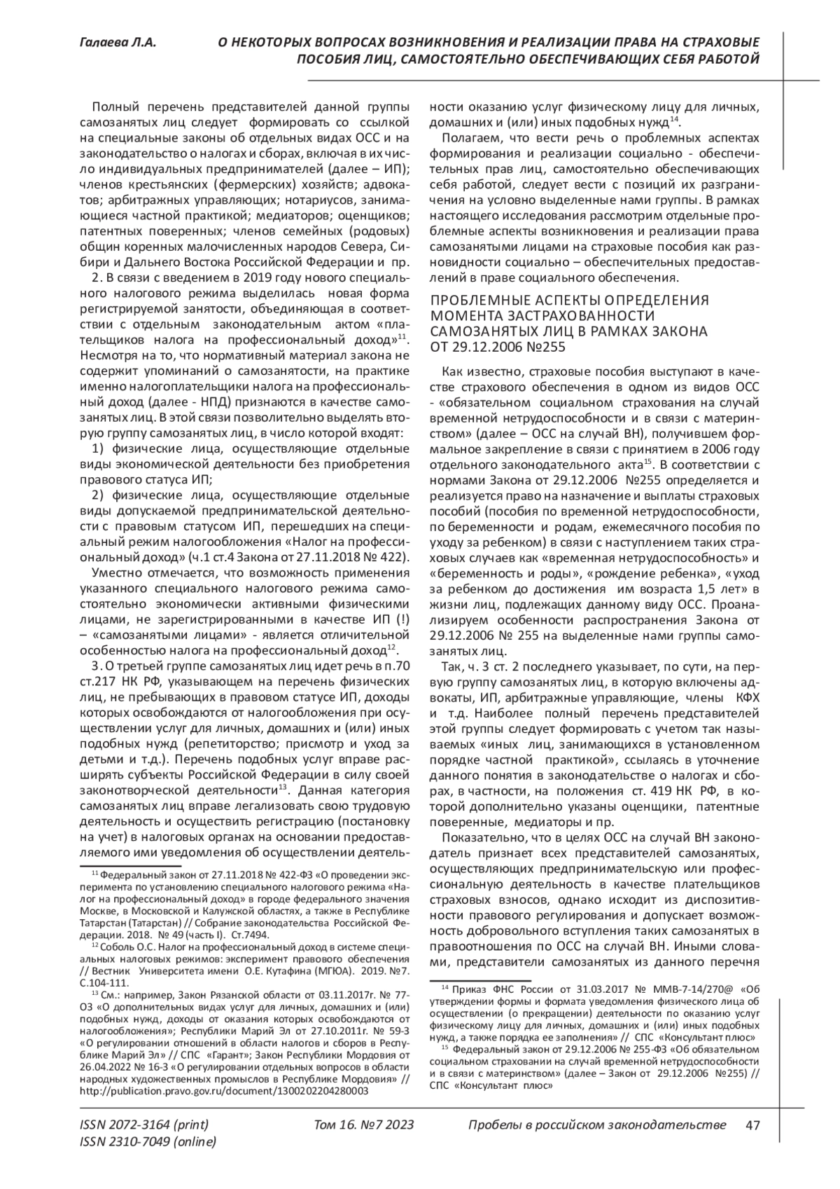 2. 	Галаева Л.А., Сайфетдинова А.Ф Правовые вопросы включения лиц, самостоятельно обеспечивающих себя работой, в систему обязательного социального страхования // Экономика. Социология. Право. 2020. №1 (17). С.120-128. EDN: SDXOUC