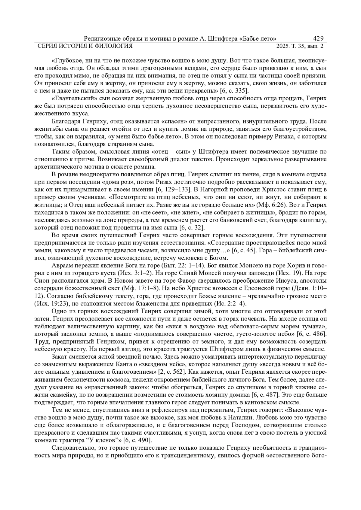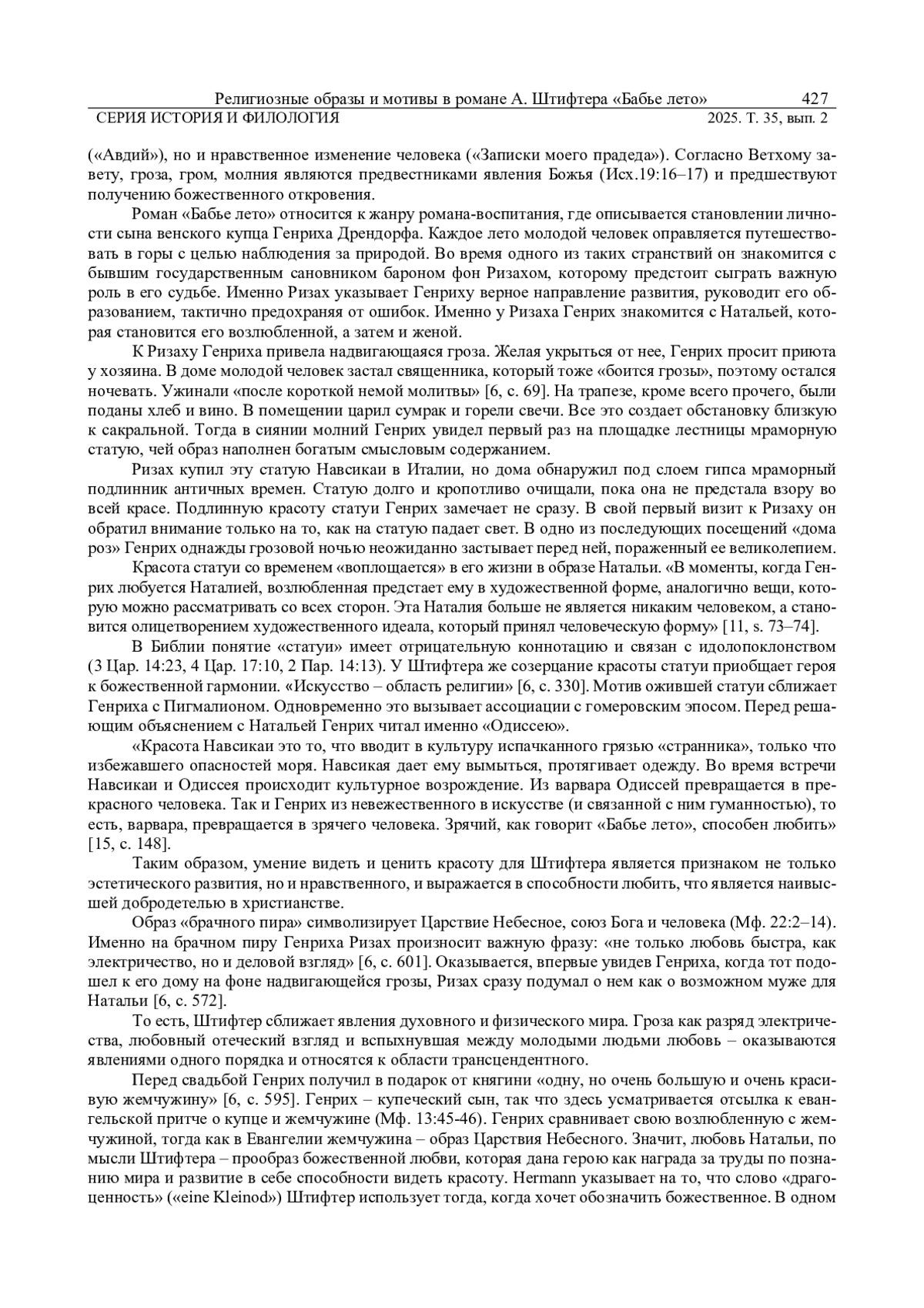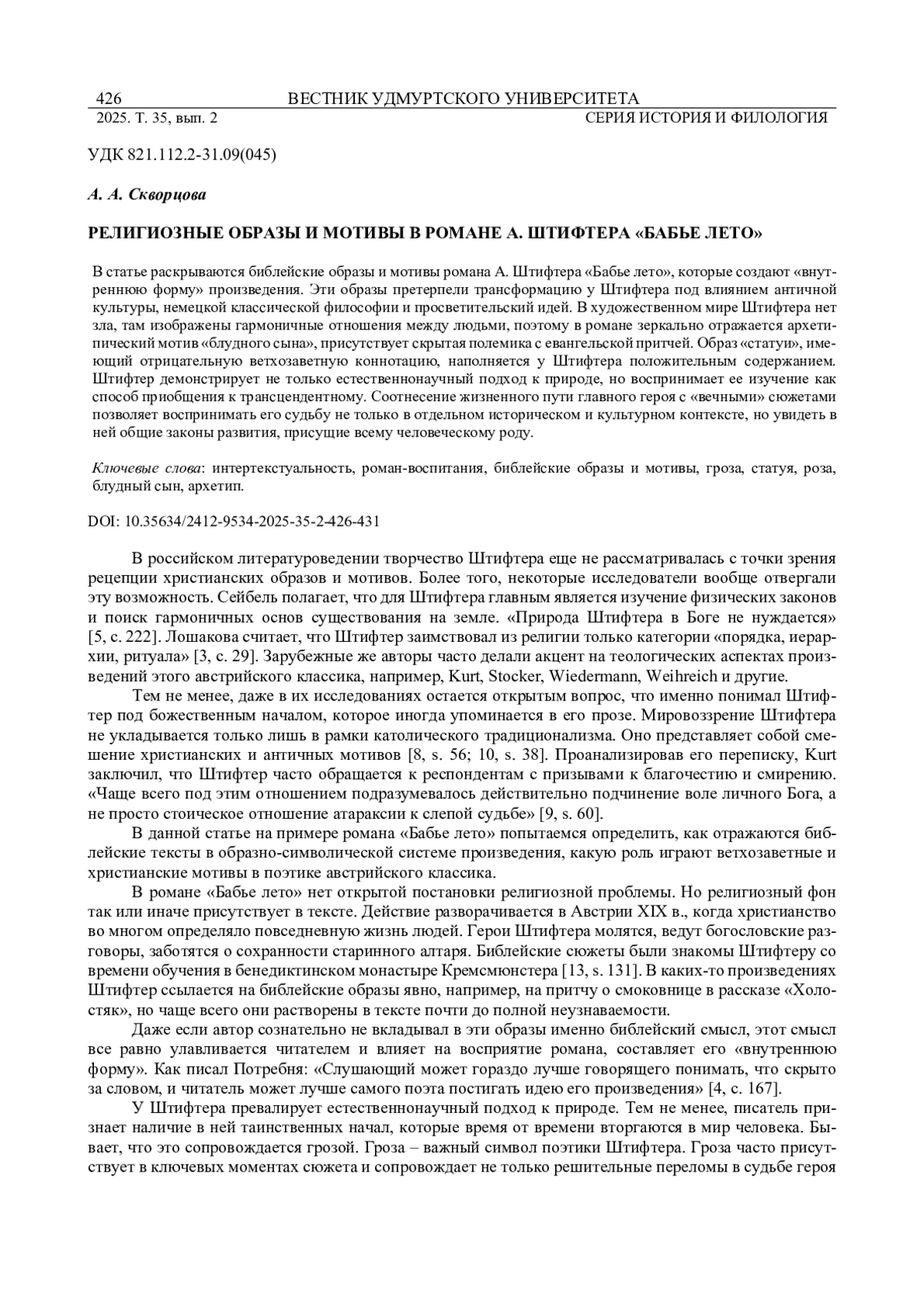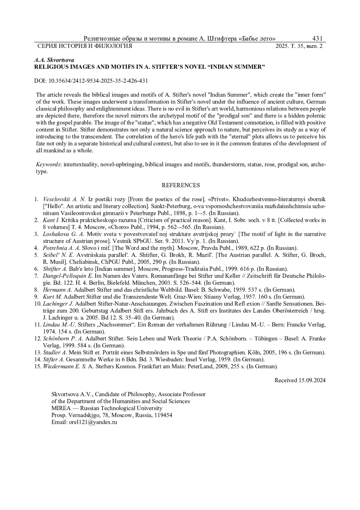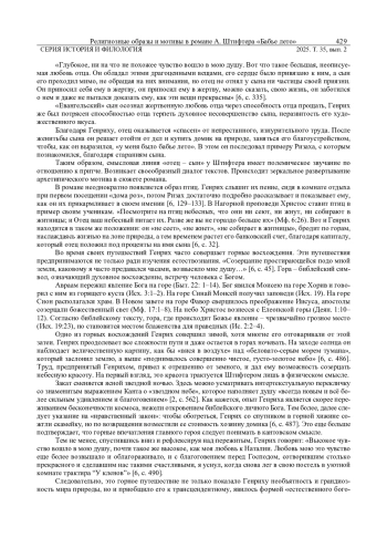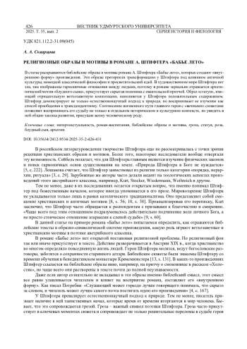 В статье раскрываются библейские образы и мотивы романа А. Штифтера «Бабье лето», которые создают «внутреннюю форму» произведения. Эти образы претерпели трансформацию у Штифтера под влиянием античной культуры, немецкой классической философии и просветительский идей. В художественном мире Штифтера нет зла, там изображены гармоничные отношения между людьми, поэтому в романе зеркально отражается архетипический мотив «блудного сына», присутствует скрытая полемика с евангельской притчей. Образ «статуи», имеющий отрицательную ветхозаветную коннотацию, наполняется у Штифтера положительным содержанием. Штифтер демонстрирует не только естественнонаучный подход к природе, но воспринимает ее изучение как способ приобщения к трансцендентному. Соотнесение жизненного пути главного героя с «вечными» сюжетами позволяет воспринимать его судьбу не только в отдельном историческом и культурном контексте, но увидеть в ней общие законы развития, присущие всему человеческому роду.