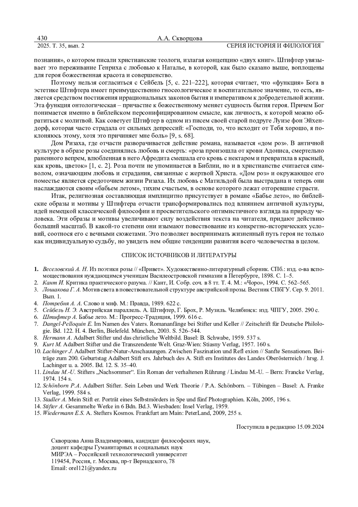 6. 	Штифтер А. Бабье лето. М.: Прогресс-Традиция, 1999. 616 с.