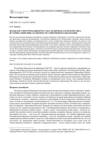 В статье рассмотрены жанровое своеобразие, история собирания, публикации и изучения, современное бытование фольклора удмуртов, проживающих в Республике Башкортостан. Фольклорные традиции данной группы народа, находящегося в отрыве от материнской части этноса, подверглись тюркскому влиянию, но, вместе с тем, сохранили многие архаичные черты. Своеобразие фольклору придает также его связь с традиционной этнической религией. Фольклор удмуртов Башкирии изучен слабо, отсутствуют сборники статей и монографические работы, ему посвященные. В последние годы предпринято исследование народных молитв и обрядового песенного творчества. В настоящее время в связи с сужением аутентичной среды для воспроизводства фольклора, он переходит на сцену, особенно песни. Наблюдается активная ревитализация народных молитв. Большую роль в сохранении местных фольклорных образцов играют ансамбли народной самодеятельности, учителя удмуртского языка и литературы, клубные работники, библиотекари, краеведы.