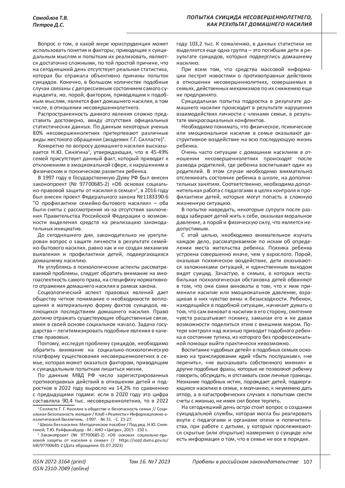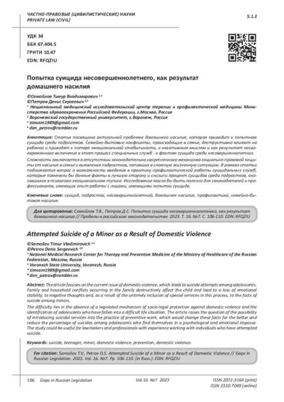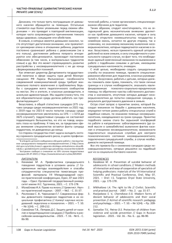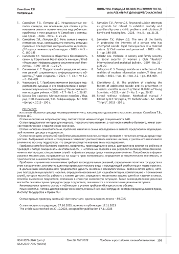4. 	Самойлов Т.В., Петров Д.С. Защита детей от насилия и предотвращение суицидов // Пробелы в российском законодательстве. - 2023. - Т. 16. - № 6. - С. 86-90. EDN: REBWTF