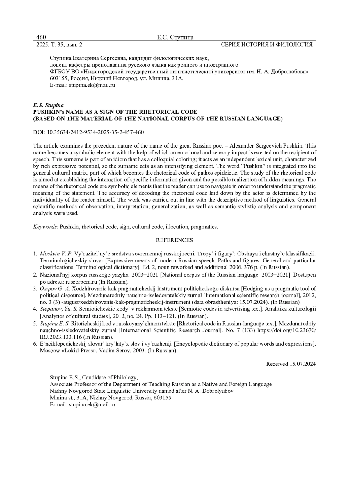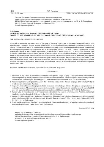 5. 	Ступина Е. С. Риторический код в русскоязычном тексте // Международный научно-исследовательский журнал № 7 (133). DOI: 10.23670/IRJ.2023.133.116