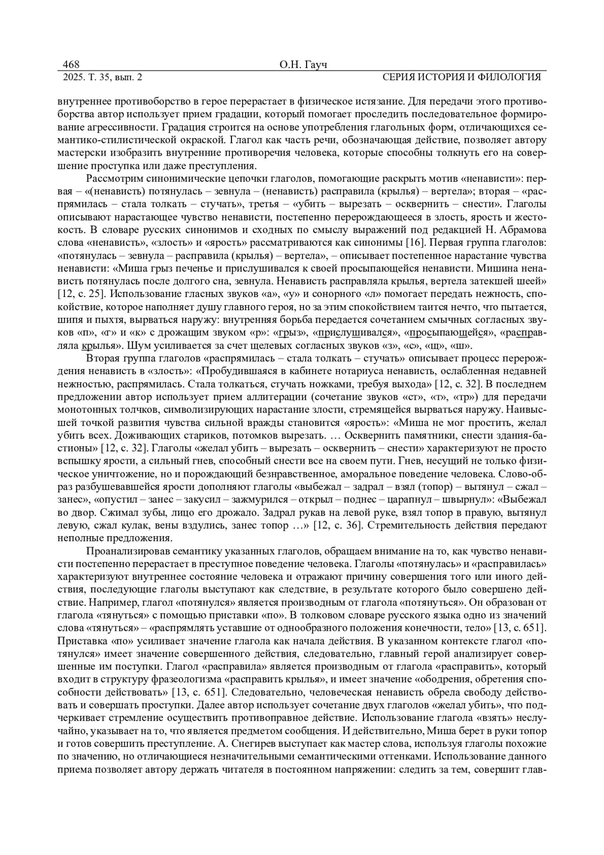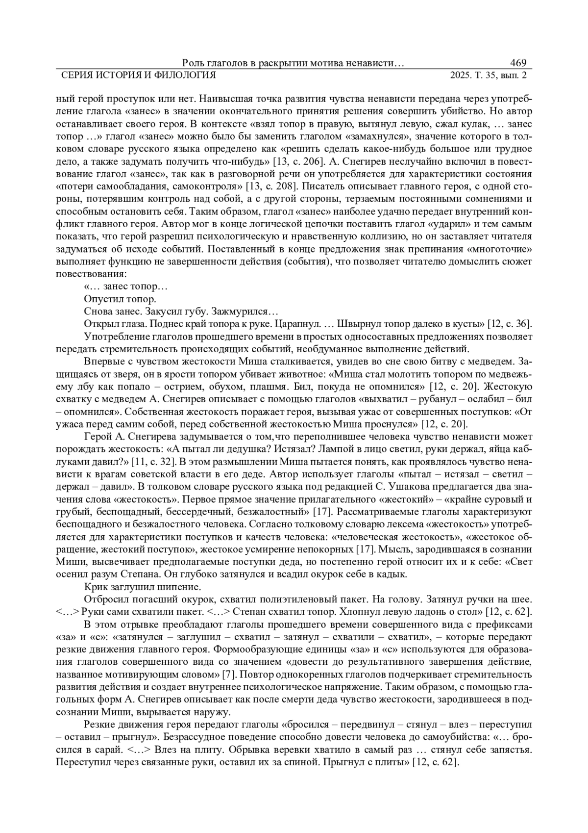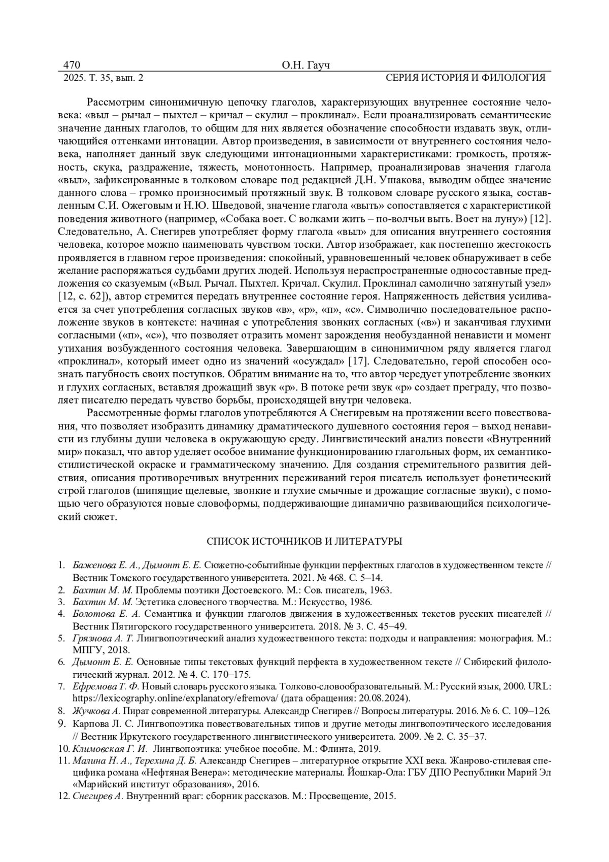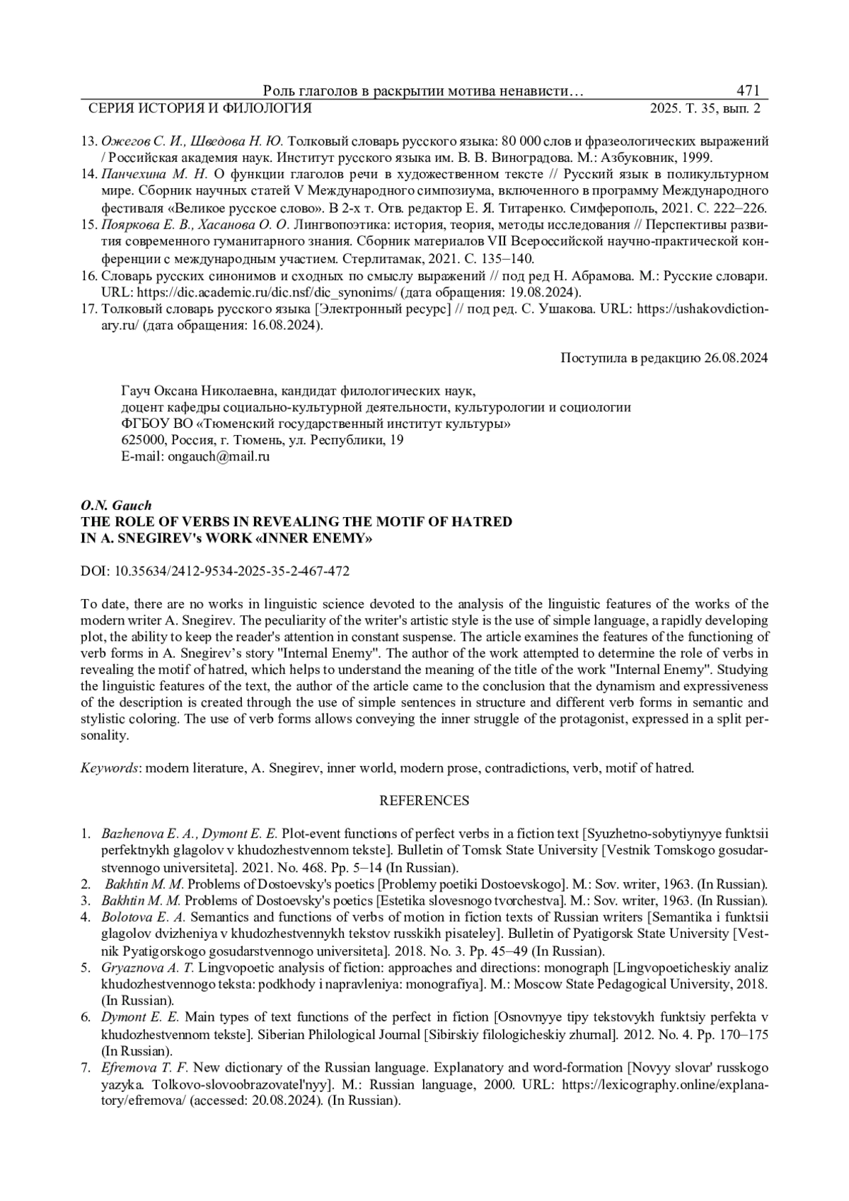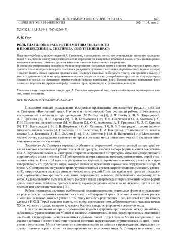 Языковые особенности произведений А. Снегирева, к сожалению, до сих пор не привлекли внимание исследователей. Своеобразие его художественного стиля определяется кажущейся простотой языка, стремительно развивающимся сюжетом, умением держать внимание читателя в постоянном напряжении. В статье рассматривается специфика функционирования глагольных форм в повести «Внутренний враг», предпринята попытка определить роль глаголов в раскрытии душевного состояния, переживаемого героем, которое помогает понять смысл названия произведения. Исследуя языковые особенности текста, мы пришли к выводу о том, что динамичность и экспрессивность описания создается за счет употребления простых по структуре предложений и разных по семантико-стилистической окраске глагольных форм. Использование глагольных форм позволяет передать внутреннюю борьбу главного героя, приведшую к раздвоению личности.