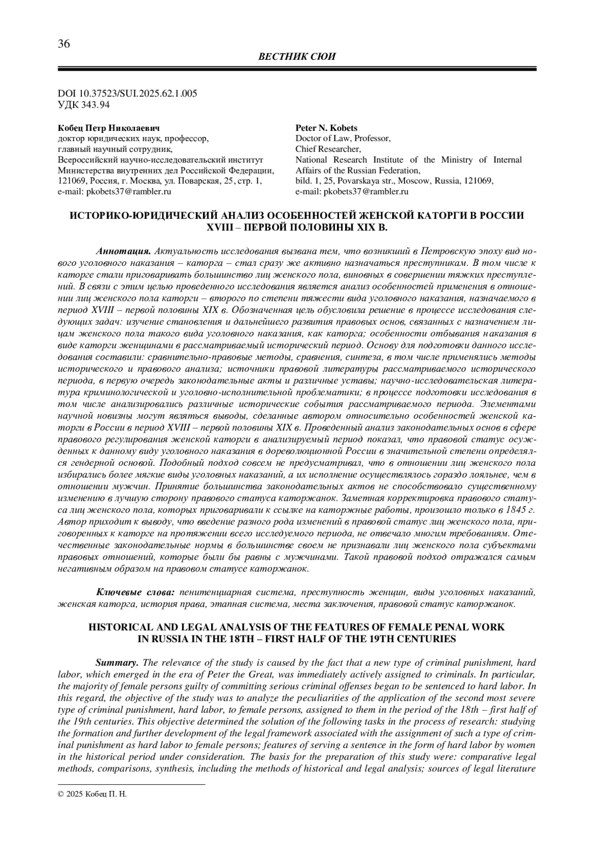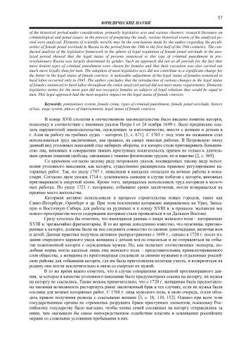 Актуальность исследования вызвана тем, что возникший в Петровскую эпоху вид нового уголовного наказания - каторга - стал сразу же активно назначаться преступникам. В том числе к каторге стали приговаривать большинство лиц женского пола, виновных в совершении тяжких преступлений. В связи с этим целью проведенного исследования является анализ особенностей применения в отношении лиц женского пола каторги - второго по степени тяжести вида уголовного наказания, назначаемого в период XVIII - первой половины XIX в. Обозначенная цель обусловила решение в процессе исследования следующих задач: изучение становления и дальнейшего развития правовых основ, связанных с назначением лицам женского пола такого вида уголовного наказания, как каторга; особенности отбывания наказания в виде каторги женщинами в рассматриваемый исторический период. Основу для подготовки данного исследования составили: сравнительно-правовые методы, сравнения, синтеза, в том числе применялись методы исторического и правового анализа; источники правовой литературы рассматриваемого исторического периода, в первую очередь законодательные акты и различные уставы; научно-исследовательская литература криминологической и уголовно-исполнительной проблематики; в процессе подготовки исследования в том числе анализировались различные исторические события рассматриваемого периода. Элементами научной новизны могут являться выводы, сделанные автором относительно особенностей женской каторги в России в период XVIII - первой половины XIX в. Проведенный анализ законодательных основ в сфере правового регулирования женской каторги в анализируемый период показал, что правовой статус осужденных к данному виду уголовного наказания в дореволюционной России в значительной степени определялся гендерной основой. Подобный подход совсем не предусматривал, что в отношении лиц женского пола избирались более мягкие виды уголовных наказаний, а их исполнение осуществлялось гораздо лояльнее, чем в отношении мужчин. Принятие большинства законодательных актов не способствовало существенному изменению в лучшую сторону правового статуса каторжанок. Заметная корректировка правового статуса лиц женского пола, которых приговаривали к ссылке на каторжные работы, произошло только в 1845 г. Автор приходит к выводу, что введение разного рода изменений в правовой статус лиц женского пола, приговоренных к каторге на протяжении всего исследуемого периода, не отвечало многим требованиям. Отечественные законодательные нормы в большинстве своем не признавали лиц женского пола субъектами правовых отношений, которые были бы равны с мужчинами. Такой правовой подход отражался самым негативным образом на правовом статусе каторжанок.