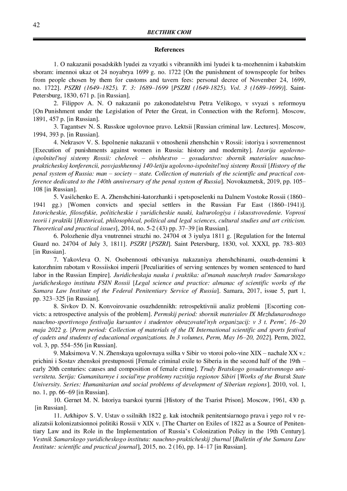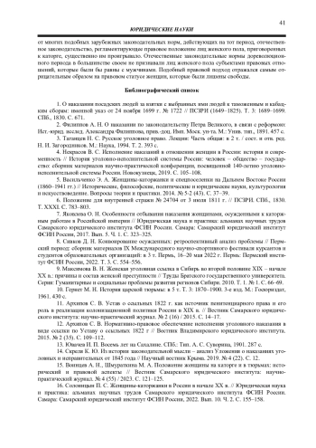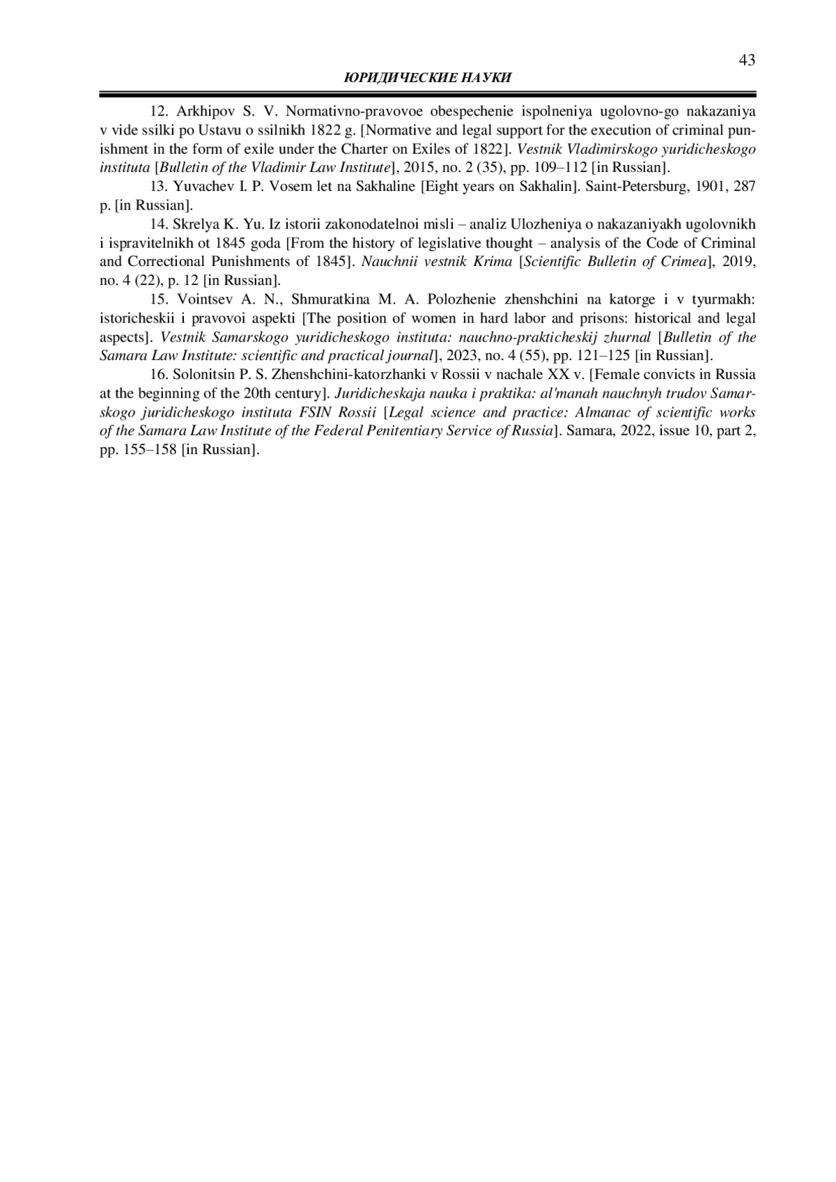 15. Воинцев А. Н., Шмураткина М. А. Положение женщины на каторге и в тюрьмах: исторический и правовой аспекты // Вестник Самарского юридического института: научно-практический журнал. № 4 (55) / 2023. С. 121-125.