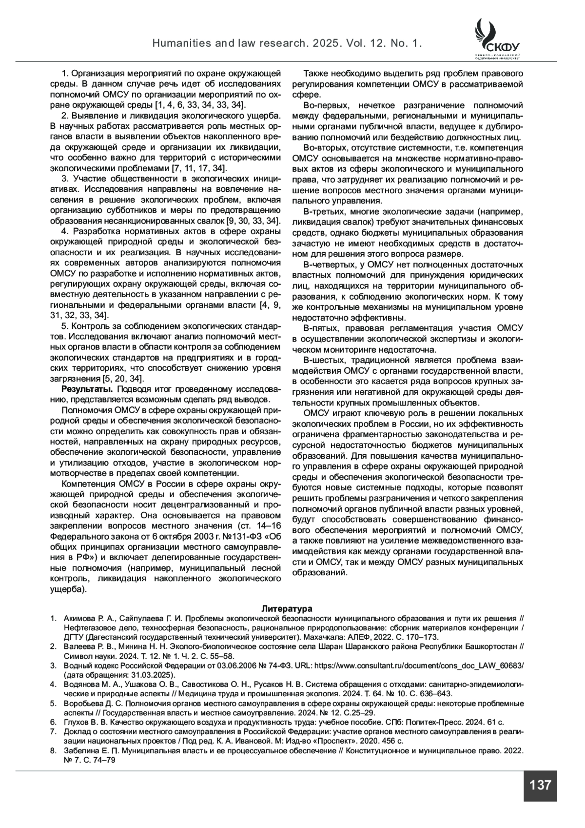 22. Рубченко Н. А. Полномочия органов местного самоуправления в сфере охраны окружающей среды // Конституционное и муниципальное право. 2022. № 5. С. 62-67.