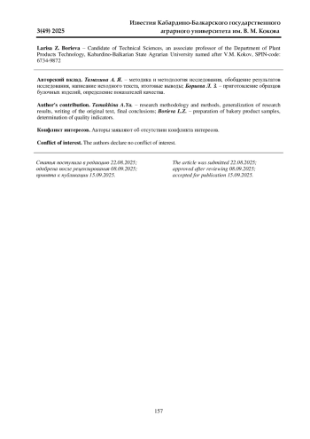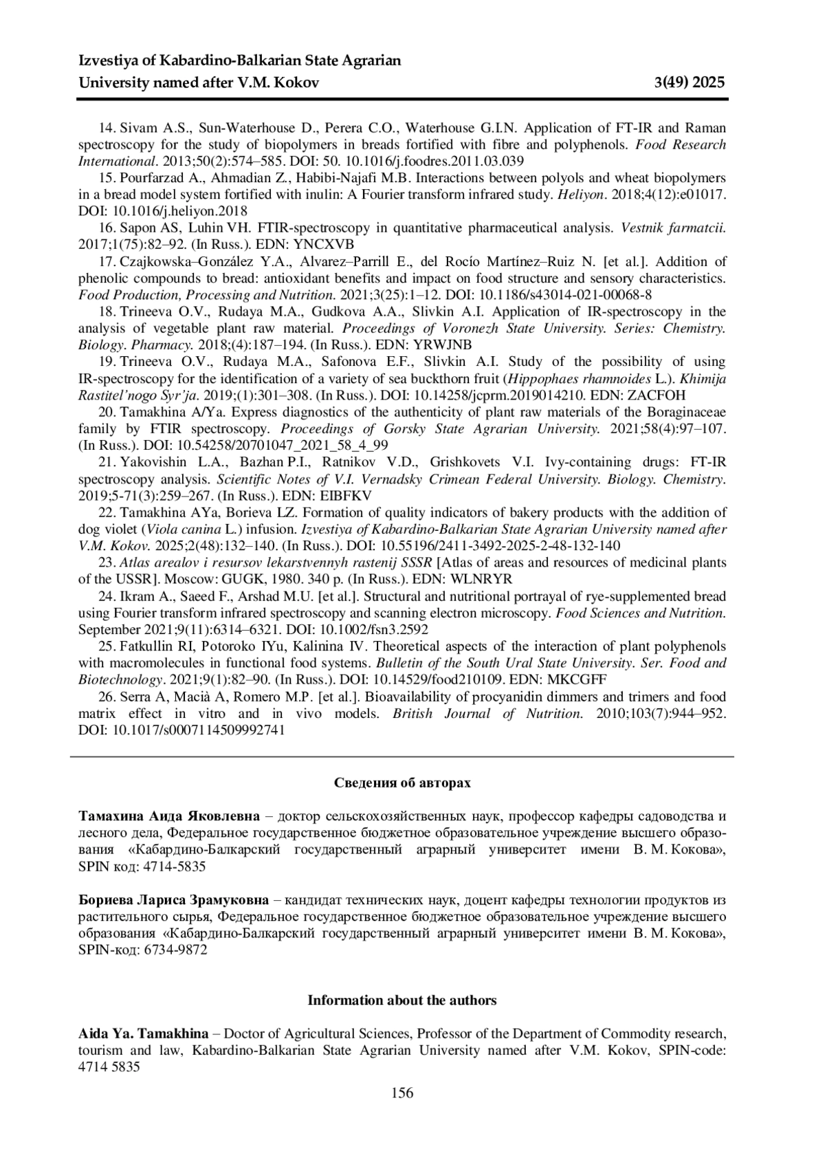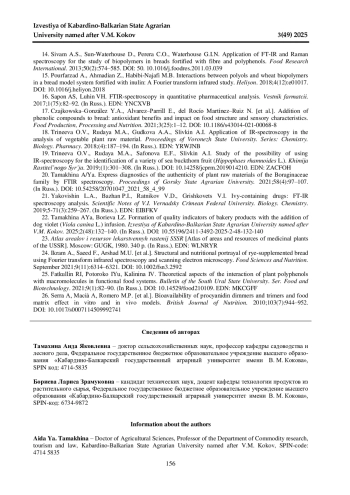 22. 	Тамахина А. Я., Бориева Л. З. Формирование показателей качества булочного изделия при добавлении настоя фиалки собачьей (Viola canina L.) // Известия Кабардино-Балкарского государственного аграрного университета им. В. М. Кокова. 2025. № 2 (48). С. 132-140. DOI: 10.55196/2411-3492-2025-2-48-132-140 EDN: WFHYDY