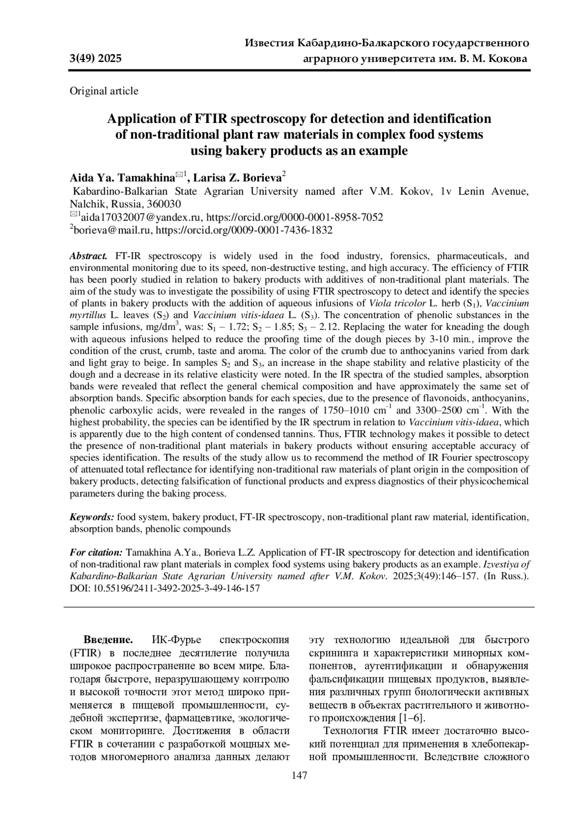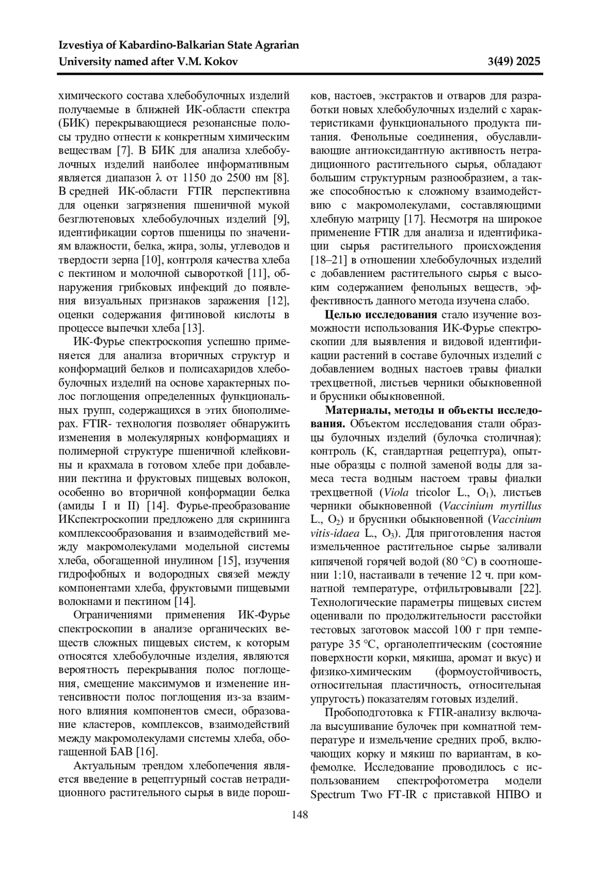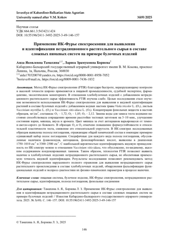 Метод ИК-Фурье спектроскопии (FTIR) благодаря быстроте, неразрушающему контролю и высокой точности широко применяется в пищевой промышленности, судебной экспертизе, фармацевтике, экологическом мониторинге. В отношении хлебобулочных изделий с добавлением нетрадиционного растительного сырья эффективность FTIR изучена слабо. Целью исследования стало изучение возможности использования ИК-Фурье спектроскопии для выявления и видовой идентификации растений в составе булочных изделий с добавлением водных настоев травы Viola tricolor L. (О1), листьев Vaccinium myrtillus L. (О2) и Vaccinium vitis-idaea L. (О3). Концентрация фенольных веществ в настоях образцов, мг/дм3, составила: О1 - 1,72; О2 - 1,85; О3 - 2,12. Замена воды для замеса теста водными настоями способствовала сокращению времени расстойки тестовых заготовок на 3-10 мин., улучшению состояния корки, мякиша, вкуса и аромата. Цвет мякиша за счет антоцианов варьировался от темно- и светло-серого до бежевого. В образцах О2 и О3 отмечено повышение формоустойчивости и относительной пластичности теста, снижение его относительной упругости. В ИК-спектрах исследованных образцов выявлены полосы поглощения, отражающие общий химический состав и имеющие примерно одинаковый набор полос поглощения. Специфичные для каждого вида полосы поглощения, обусловленные наличием флавоноидов, антоцианов, фенолкарбоновых кислот, выявлены в диапазонах 1750-1010 см-1 и 3300-2500 см-1. С наибольшей вероятностью идентифицировать видовую принадлежность по ИК-спектру можно в отношении Vaccinium vitis-idaea, что обусловлено, по-видимому, высоким содержанием конденсированных танинов. Таким образом, технология FTIR позволяет выявить наличие в хлебобулочных изделиях нетрадиционного растительного сырья, не обеспечивая приемлемую точность видовой идентификации. Результаты исследования позволяют рекомендовать метод ИК-Фурье спектроскопии нарушенного полного отражения для выявления нетрадиционного сырья растительного происхождения в составе хлебобулочных изделий, обнаружения фальсификации функциональных изделий и экспресс-диагностики их физико-химических параметров в процессе выпечки.