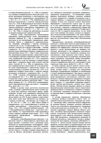 Анализ. Большую часть списка славяно-русских сложных слов, образованных с участием страсти и её видовых ипостасей (любовь, боязнь/ страх, ненависть), занимают слова с корнем люб-, за которым идут слова с корнем страст-, несколько раз здесь вербализуются ненависть и страх. Из всех многочисленных видов любви в функции активного словообразовательного компонента принимают участие три: филия (φιλία), мания (μανία) и эрос (ἔρως), а среди отрицательных словообразовательных компонентов страсти, доминирует аффиксоид -фоб(ия).