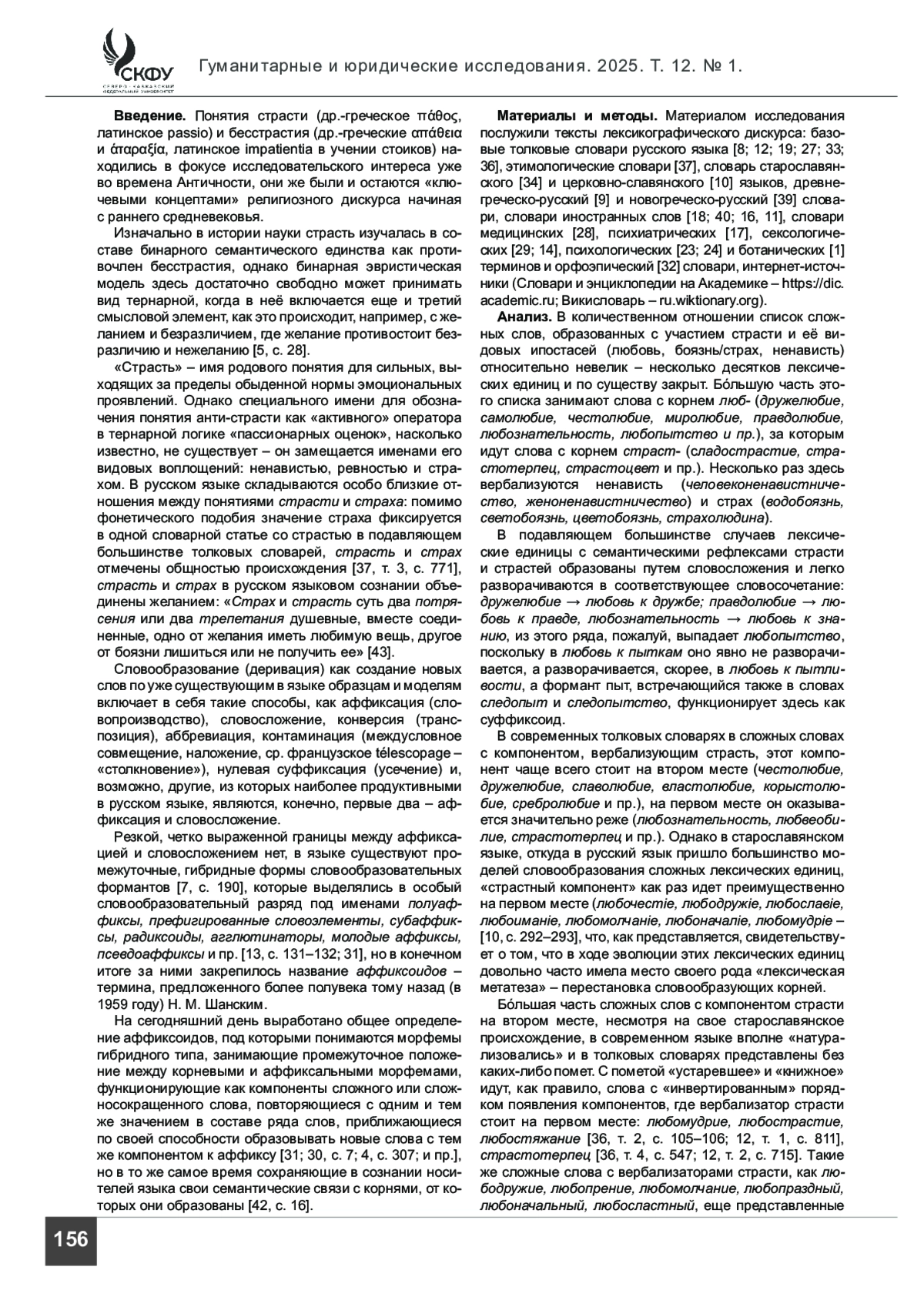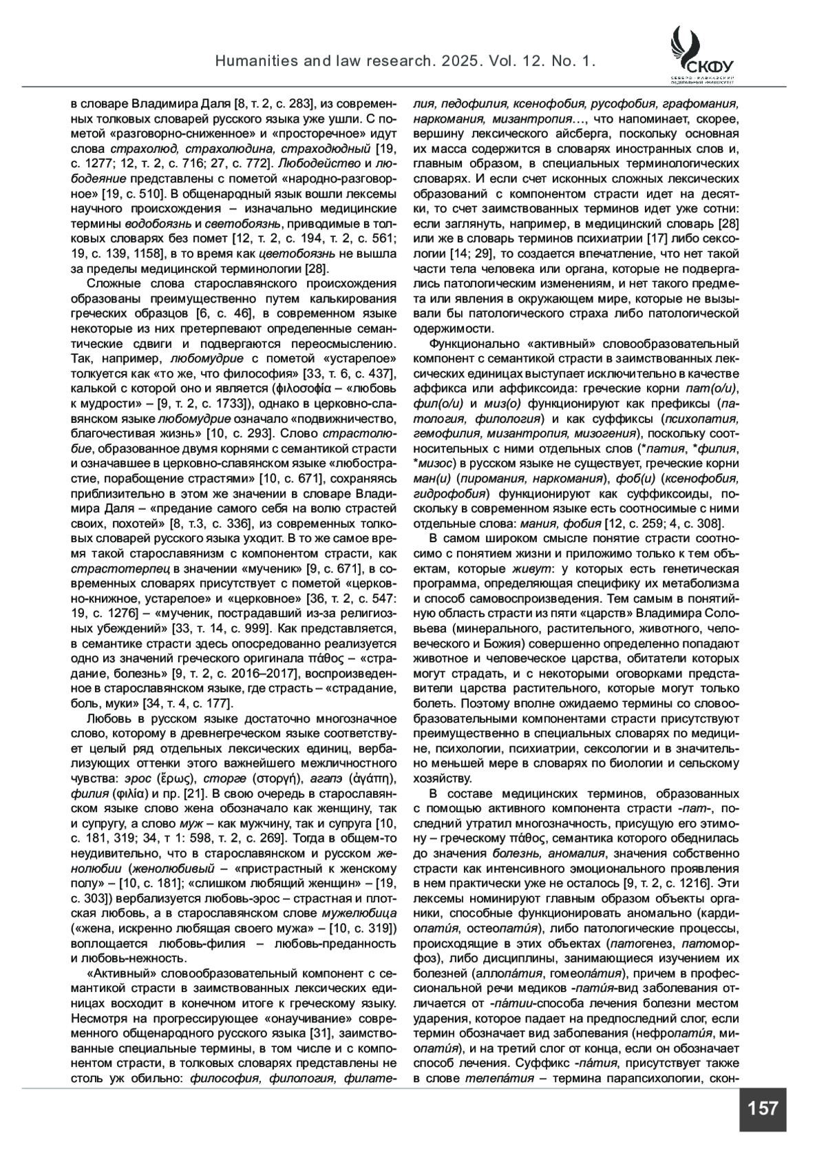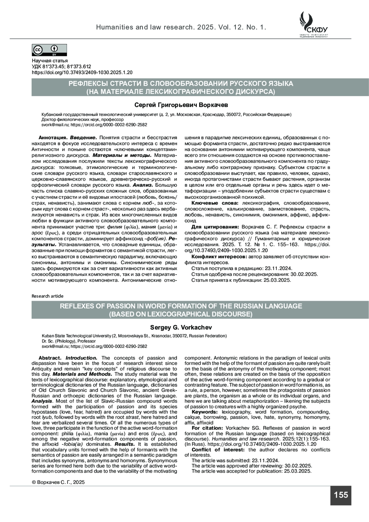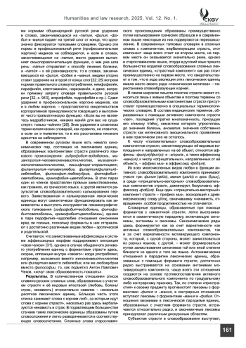 Результаты. Устанавливается, что словарные единицы, образованные при помощи формантов с семантикой страсти, легко выстраиваются в семантическую парадигму, включающую синонимы, антонимы и омонимы. Синонимические ряды здесь формируются как за счет вариативности как активных словообразовательных компонентов, так и за счет вариативности мотивирующего компонента. Антонимические отношения в парадигме лексических единиц, образованных с помощью форманта страсти, достаточно редко выстраиваются на основании антонимии мотивирующего компонента, чаще всего эти отношения создаются на основе противопоставления активного словообразовательного компонента по градуальному либо контрарному признаку. Субъектом страсти в словообразовании выступает, как правило, человек, однако, иногда протагонистами страсти бывают растения, организм в целом или его отдельные органы и речь здесь идет о метафоризации – уподоблении субъектов страсти существам с высокоорганизованной психикой.