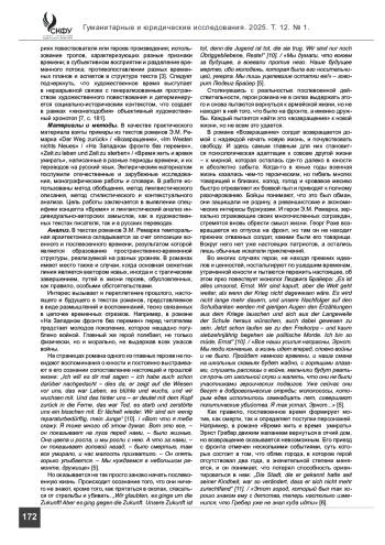 Результаты. Время – это многогранное явление. Изучение полного его понимания пока что непосильная задача. Реальное время постоянно движется вперед, из прошлого в будущее. В художественной литературе ему свойственно как поступательное, так и обратное движение. Его словесная реализация позволяет соприкоснуться не только с взаимосвязью лексических и грамматических средств, но и с авторским смыслом. Воплощаясь в слове, общеязыковые временные значения лексемы начинают дополняться индивидуально-авторскими смыслами, выстраивая особую художественную картину мира.